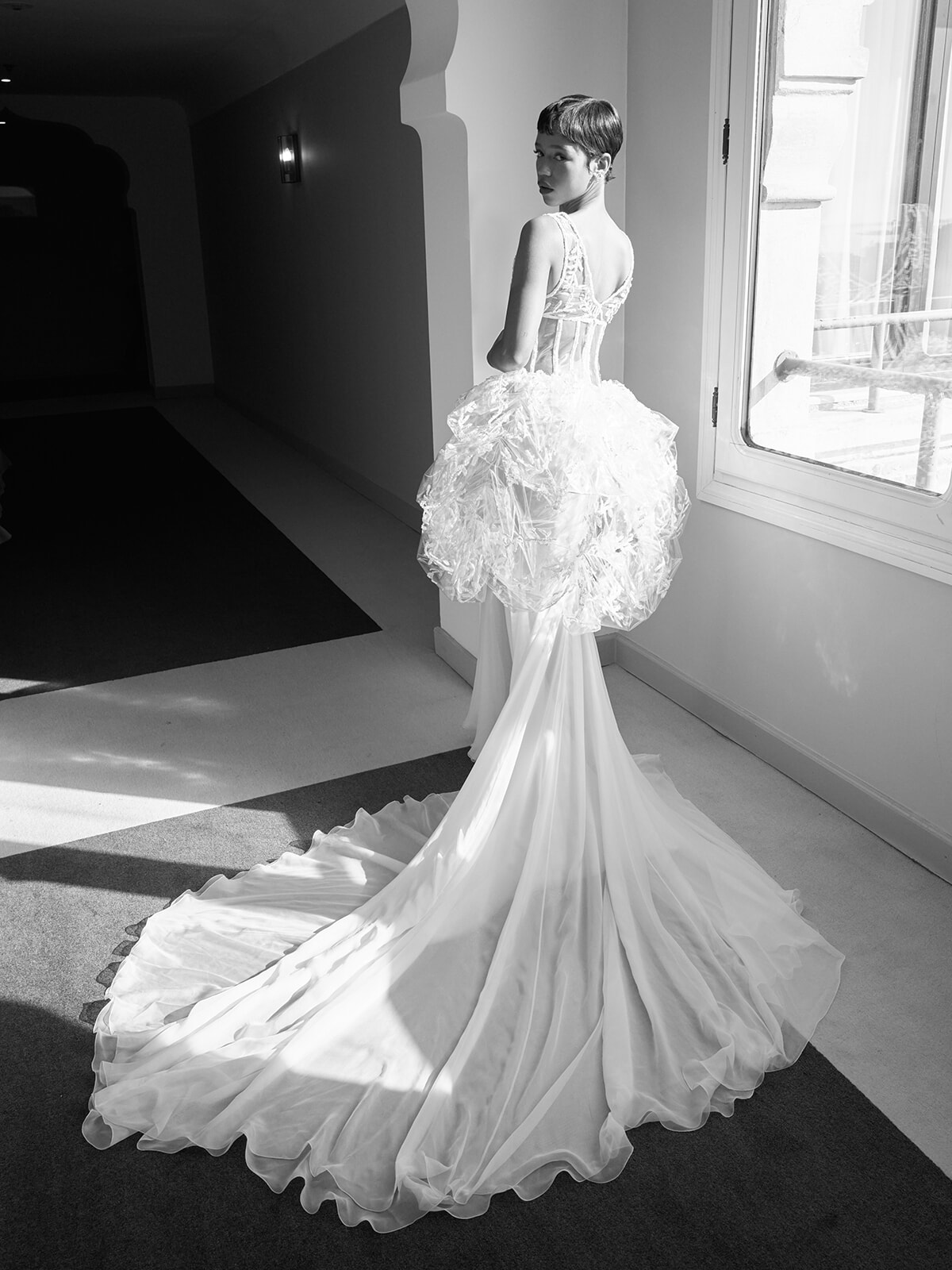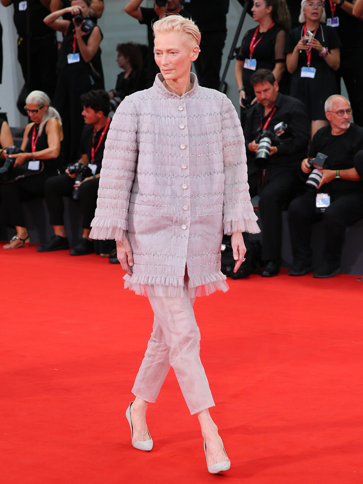今年のヴェネツィア映画祭で見事に金獅子賞を受賞した作品『The Room Next Door』に主演した女優のティルダ・スウィントンはシャネルのアンバサダーのひとり。今回は、2024年春夏のオートクチュールコレクションから、プリーツとギャザーを施したグレーのシフォンにパールとスパンコールを飾ったコートをチョイス。