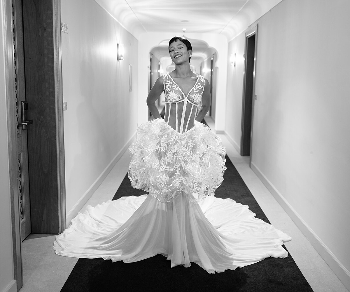 1993年春夏のオートクチュールのドレスのレプリカを纏ったのは、話題のカナダ人俳優、テイラー・ラッセル。ハンドペイントとパール、スパンコールの刺繍を施したプラスチックのコルセットにシルクシフォンのスカート、さらに刺繍を飾ったオーバースカートをレイヤード。このルックの制作には900時間ほどが費やされている。