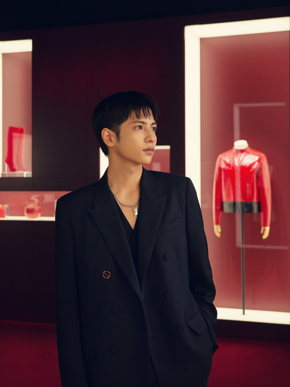 「今回の展示は、アートを見にいくような感覚でグッチの歴史を堪能できる内容。積み重ねてきた歴史やバックグラウンドを知って、さらにグッチが好きになり、これまで以上に服が楽しく着られるようになっていく。そんな学びや気持ちの変化だけでなく、グッチの世界観に深く入り込める展示になっていますので、皆さんに見ていただきたいです」(志尊淳)