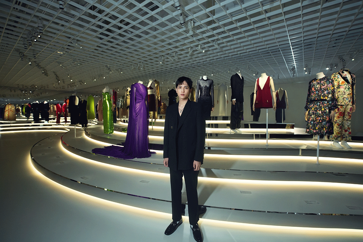 「長い歴史のなかで、その時々のクリエイティブ・ディレクターが創造してきたデザインや、時代を築いてきた革新性のある表現を直接アイテムを見ながら感じられるのは、素晴らしい時間。展示の中で歴史を築いたアーカイブ作品を知り、さらにその時代の写真も飾られていて、どんな時代にどうやって生まれたかまでを深く理解できました」(志尊淳)これまでさまざまなグッチの展示に参加してきた中でも、「GUCCI COSMOS」は最も没入感があり、紡がれてきた時間を身近にを感じられたと言う。