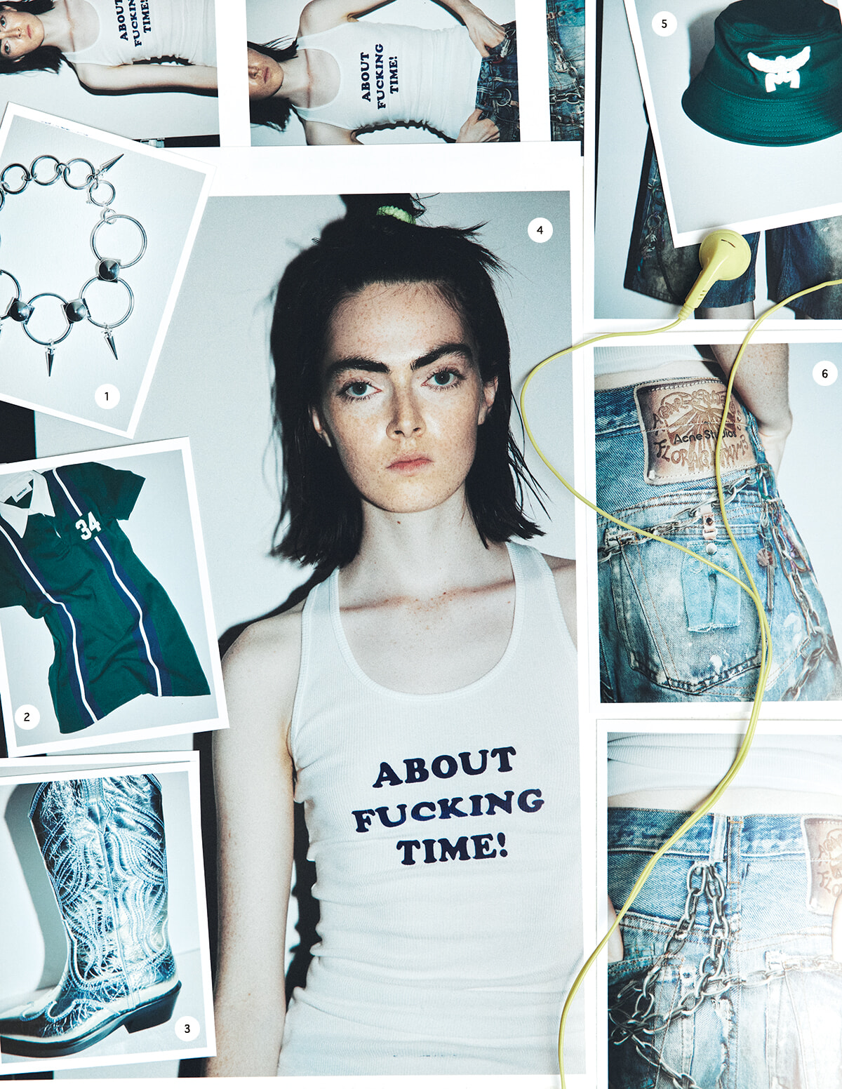 1.鎖のディテールやシルバーの煌めきが反骨精神を表現するネックレス¥50,600/ジュンヤ ワタナベ(コム デ ギャルソン) 2.ユースカルチャーを体現するユニフォームドレス¥53,900(参考価格)/アンブッシュ®(アンブッシュ® ワークショップ) 3.エネルギッシュなウエスタンブーツ(ヒール4cm)¥59,900/デシグアル(デシグアルストア 銀座中央通り店) 4.2024年秋冬コレクションのマニフェストとして掲げられたメッセージ。タンクトップ¥44,000/ステラ マッカートニー(ステラ マッカートニー カスタマーサービス) 5.月桂樹ロゴが個性を主張するバケットハット¥40,700/エムシーエム(エムシーエムギンザ ハウス アイン) 6.ストリートアートを彷彿とさせるリアルなペイントが施されたデニムパンツ¥92,400/アクネ ストゥディオズ(アクネ ストゥディオズ アオヤマ)