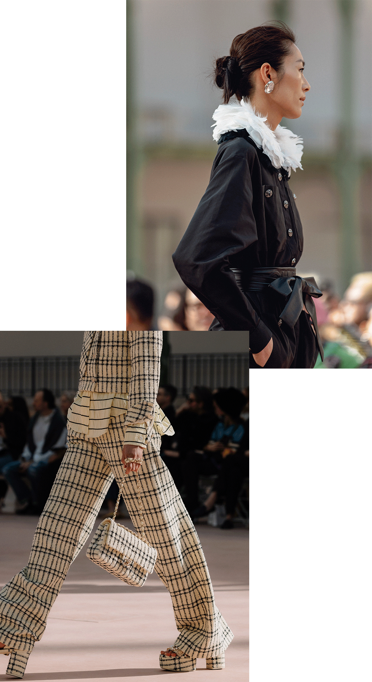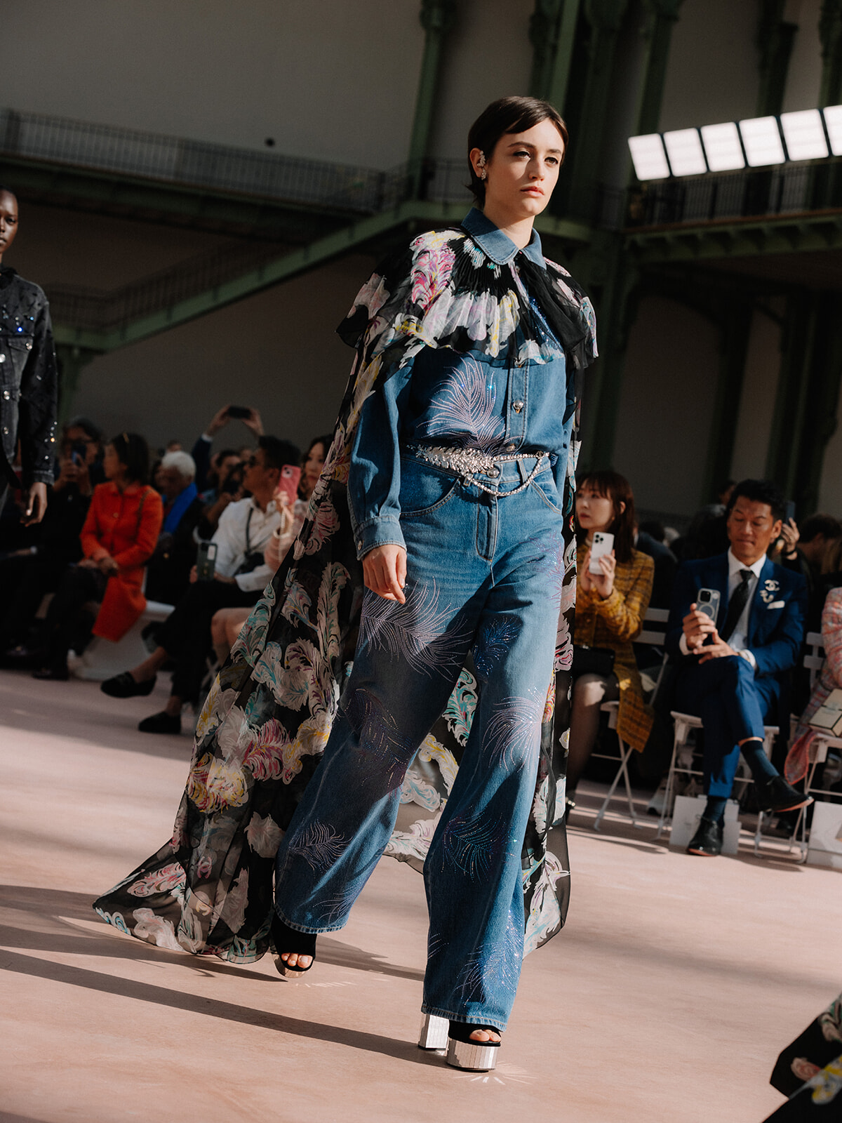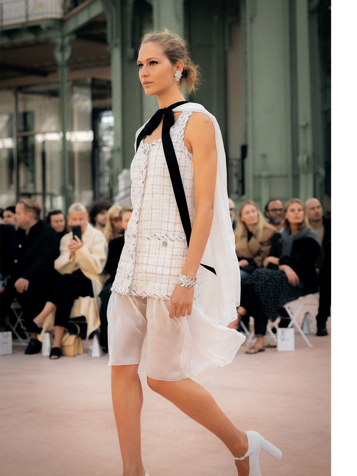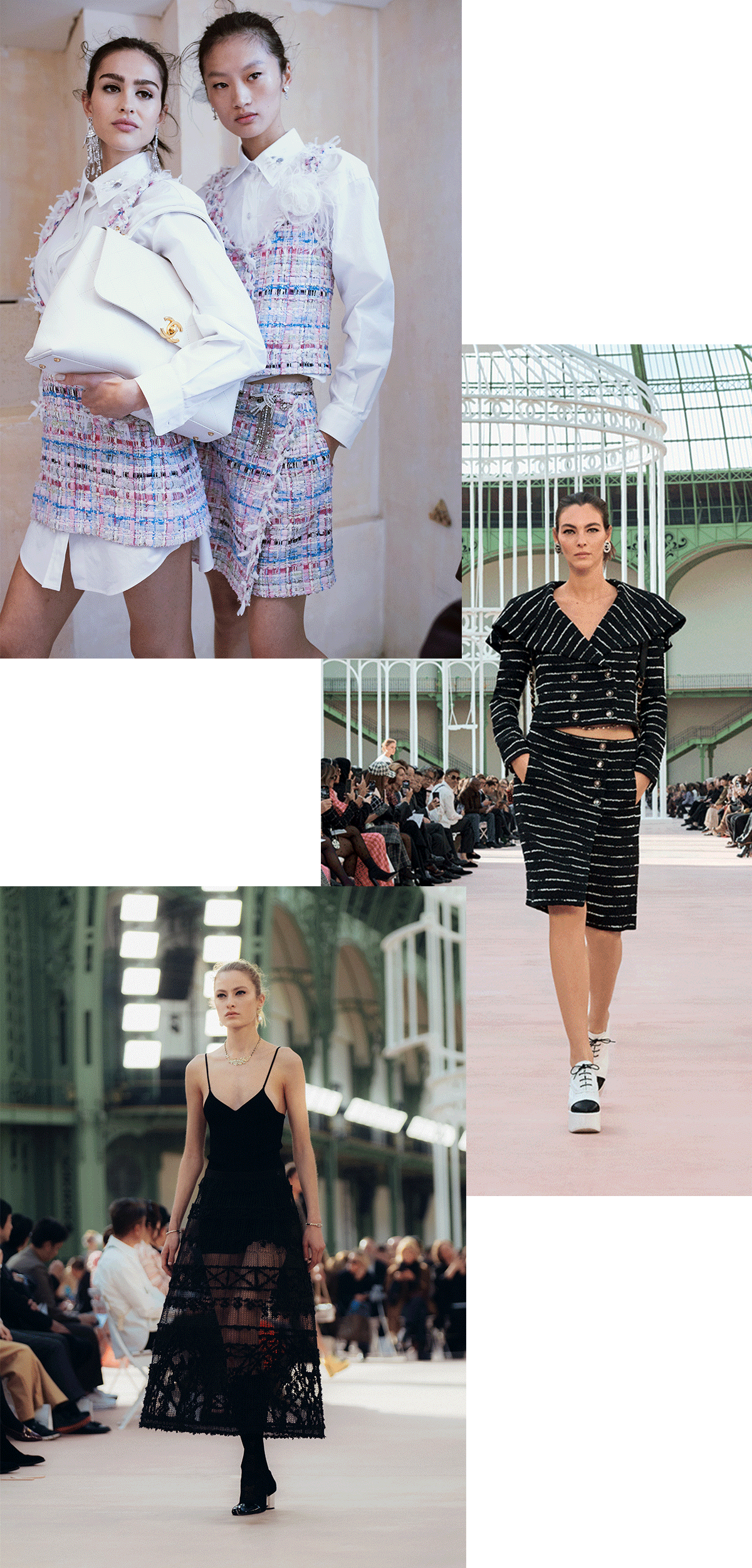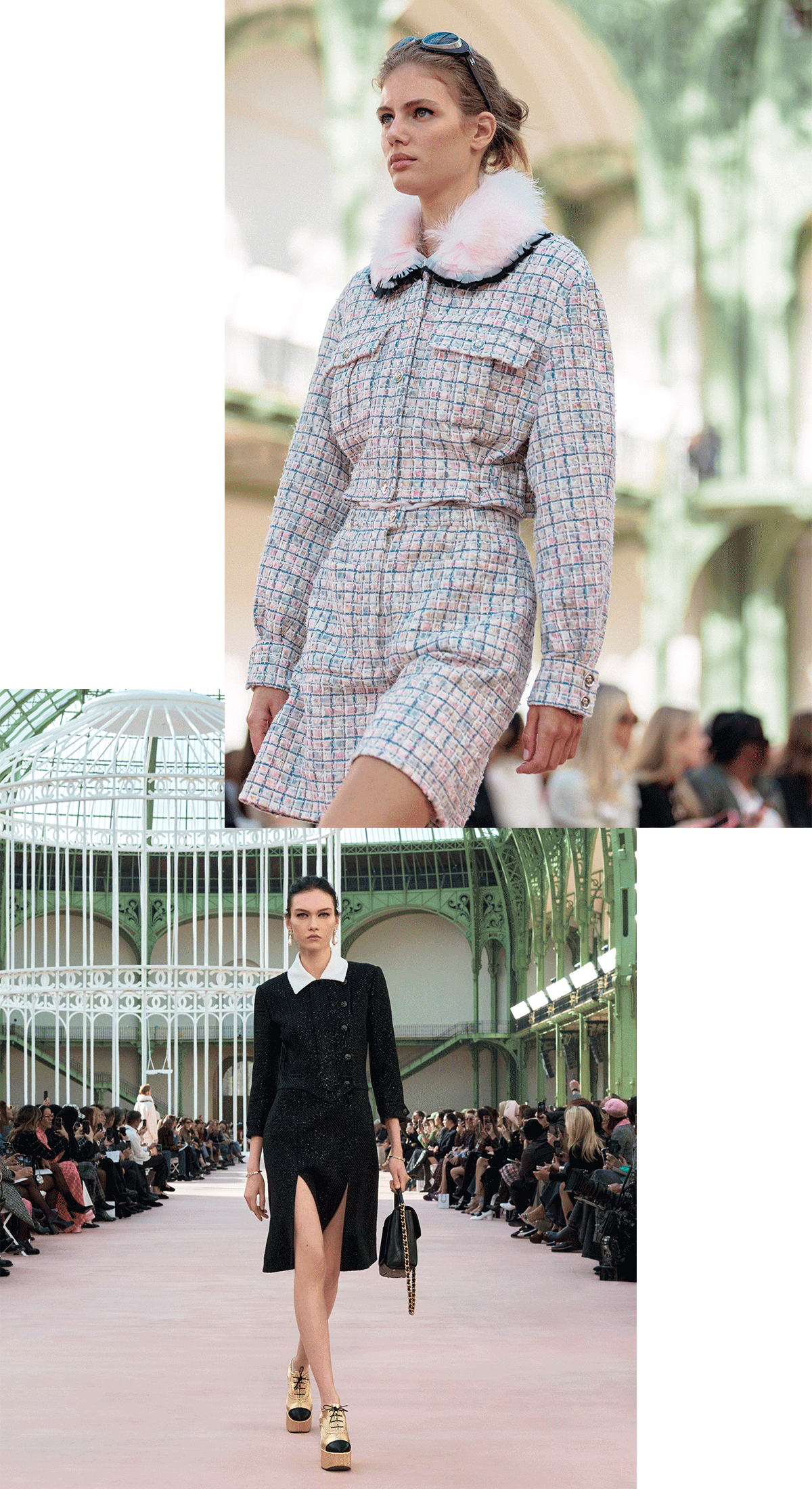 1900年のパリ万国博覧会のために建てられたグラン・パレ。シャネルは2005年に中央の身廊を舞台にショーを開催して以来、長年、この場所で新作を発表してきた。2018年以降、メゾンはグラン・パレ・フランス国立武術関連合への寄付基金を通して、その文化と芸術のプログラムの支援を開始。建物の修復と改修をサポートすることを表明し、グラン・パレ本来のデザインの独創性と美しい姿を甦らせる大規模な試みに着手することに。修復プロジェクトにより、かつての輝きを取り戻しつつあるグラン・パレ。2024年4月にはメゾンの創業者への敬意を表して、「ガブリエル・シャネル」の名前が刻まれた身廊のエントランスが完成し、話題を集めた。新たに蘇ったこの場所では、今後、ファインアートやコンテンポラリーアート、ライブなど様々なエンターテイメントのイベントが開催される予定。5年間に渡り継続される取り組みを支援することにより、シャネルはグラン・パレの主要な支援メゾンとなる。その新たな歴史の幕開けを迎えた、パリを象徴する場所で2025年春夏 プレタポルテコレクションのショーを華々しく開催。メゾンが縁のあるグラン・パレに再び舞い戻ってきた今シーズン、シャネルらしい華麗で壮大は世界を披露してくれた。