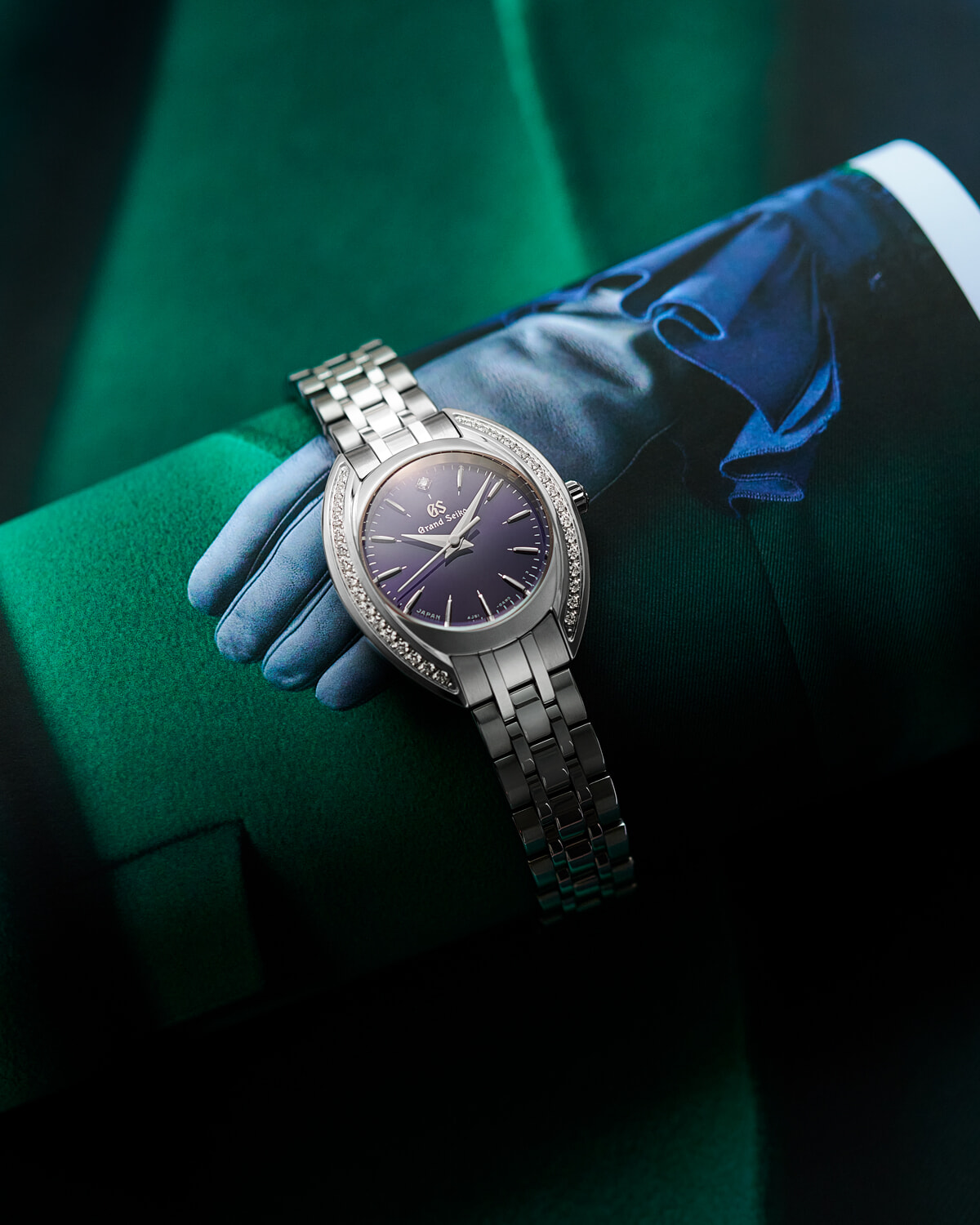 たとえばグローブのレディな佇まいのように、品格あふれる、凛としたコーディネートを完成させるのが、「深紫(こきむらさき)」で彩られたタイムピース。日本古来の美意識を腕時計の世界へと注ぎ込んできた、グランドセイコーらならではの仕立てだ。この奥ゆかしき色彩にコントラストを与えるのが、女性らしい美しさを追求した流麗なフォルム。風防を囲む丸形のベゼルをあえて排し、両サイドのふたつのアーチを強調したベゼルレスのデザインが、丸みを帯びたドーム型の風防とともに、水滴のように瑞々しい、有機的な美しさを織りなしている。最大限の光を取り込んで輝く立体的なダイヤモンドセッティングとザラツ研磨により際立つシャープなラインが調和し、やさしいムードに満ちた、エフォートレスな手元を演出する。