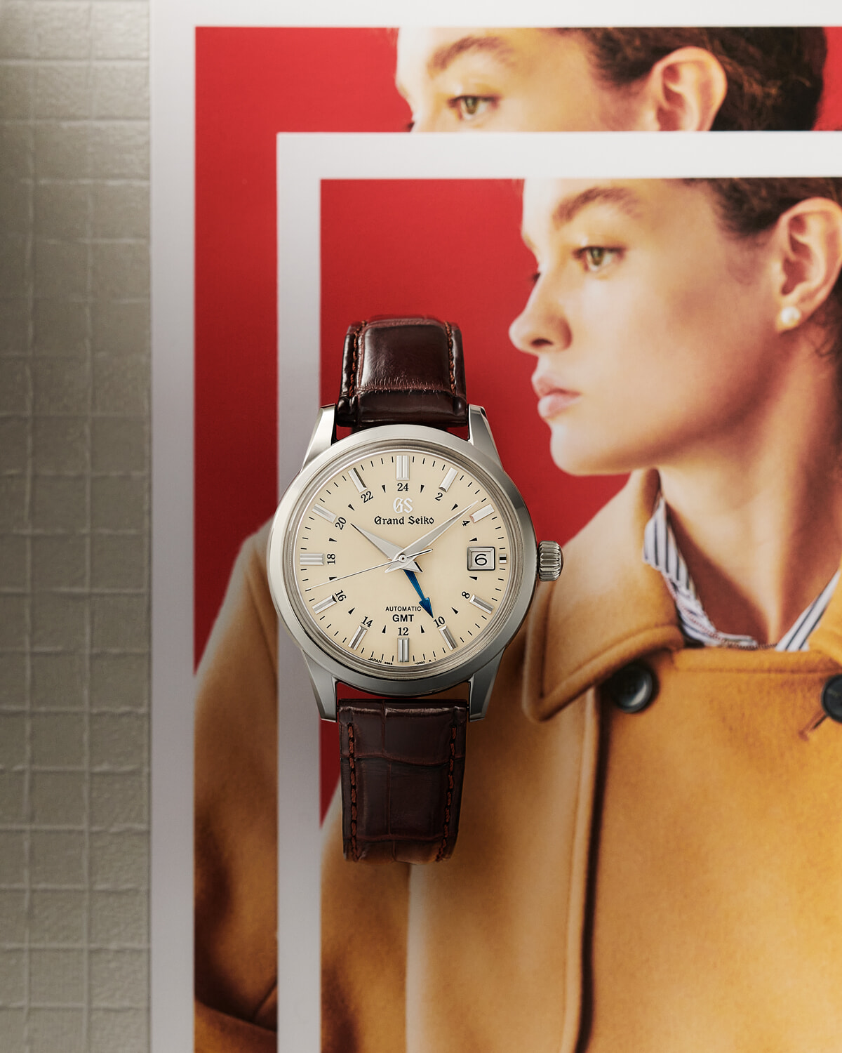 マニッシュなコートスタイルをさらにドラマティックに演出するのが、少し大きめのハンサムウォッチ。これまでレディスモデルのマーケットでは比較的小さめサイズの時計が選ばれてきたが、ここ数年はこの直径39.5mmのような、ユニセックスなサイズ感にも注目が寄せられている。そんなトレンドともいえるジェンダーレスウォッチをさらにノスタルジックに彩るのが、グランドセイコーで長く愛されてきた”クラシックデザイン”だ。ヴィンテージウォッチに見られるようなボックス型風防や文字盤を彩るアイボリーカラーなどのデザインが、メンズライクながらも、リラックスした雰囲気を醸し出す。かつこの「エレガンスコレクション SBGM221」は、第2時間帯を計ることができるGMTモデル。アワーインデックスの内側に24時間表示を配し、ブルースチールのGMT針が他国の時間を指し示す。使い勝手の良い機能と味わい深いデザインが、日々のライフスタイルにそっと寄り添うことだろう。