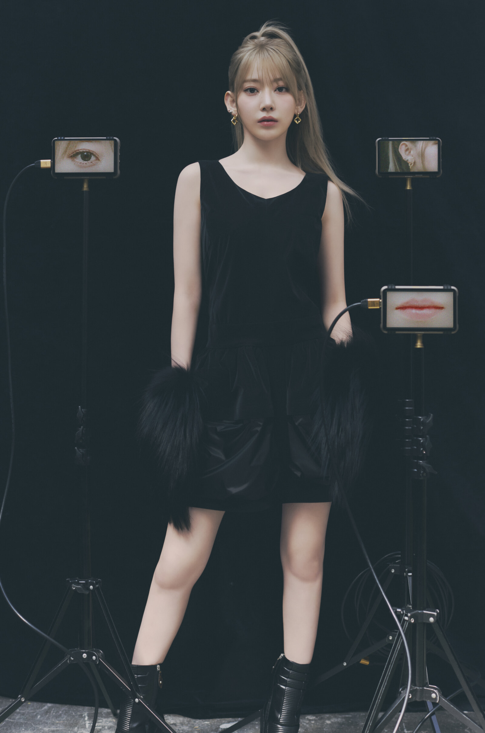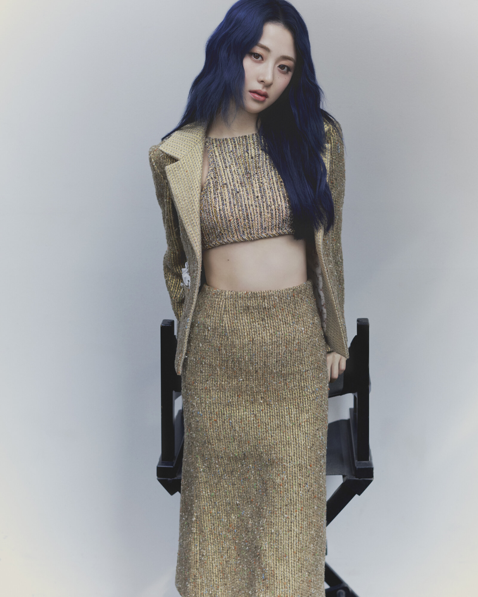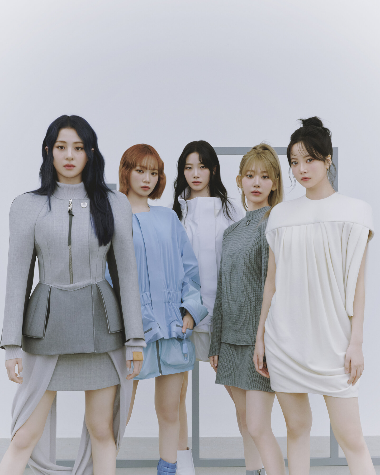着用クレジット(集合カット左から):HUH YUNJIN ジャケット¥836,000、中に着たドレス¥496,100、スカート¥308,000、パンプス¥194,700 KIM CHAEWON スポーティな要素を洗練された佇まいで。ブルゾン¥836,000、スカート¥456,500(参考価格)、ブーツ¥313,500 KAZUHA ブルゾン¥891,000、スカート¥456,500、ブーツ¥294,800 SAKURA ニット¥377,300、スカート¥218,900、ブーツ¥294,800 HONG EUNCHAE ドレス¥786,500(参考価格)、ブーツ¥294,800/以上ルイ・ヴィトン(ルイ・ヴィトン クライアントサービス)(ソロカット)KIM CHAEWON ドレス¥1,369,500、ブーツ¥294,800 SAKURA ドレス¥577,500、ピアス¥85,800、ブーツ¥294,800、グローブ(参考商品) HUH YUNJIN ジャケット¥951,500、トップ(参考商品)、スカート¥456,500、パンプス¥194,700 KAZUHA ドレス¥1,369,500(参考価格)、ベルト¥72,600、ブーツ¥294,800 HONG EUNCHAE ドレス(参考商品)、シューズ¥214,500(参考価格)/以上ルイ・ヴィトン(ルイ・ヴィトン クライアントサービス)