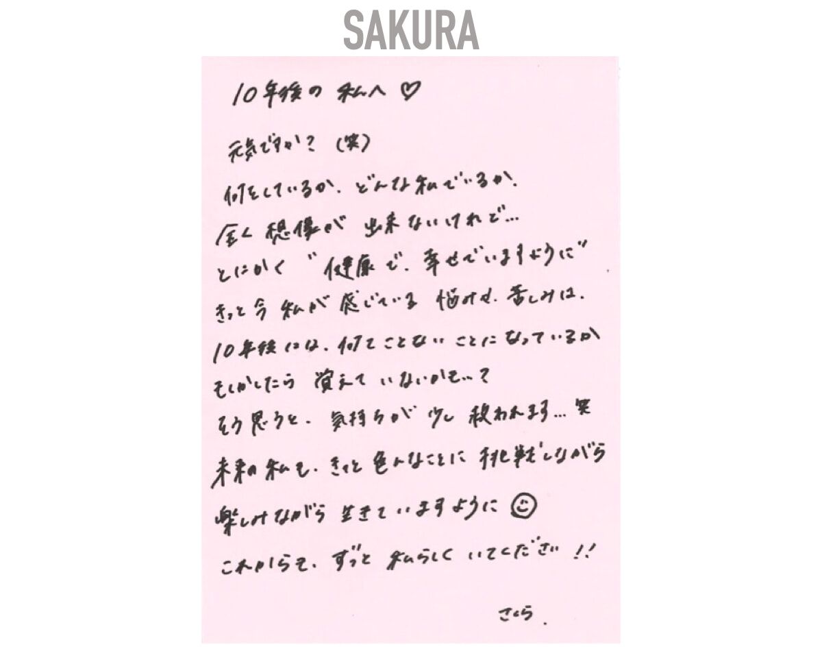元気ですか?(笑) 何をしているか、どんな私でいるか、全く想像が出来ないけれど…とにかく“健康で、幸せでいますように” きっと私が感じている悩みや苦しみは、10年後には何てことないことになっているか、もしかしたら覚えていないかも…? そう思うと気持ちが少し救われます…笑 未来の私もきっと色んなことに挑戦しながら楽しみながら生きていますように。これからもずっと私らしくいてください!!