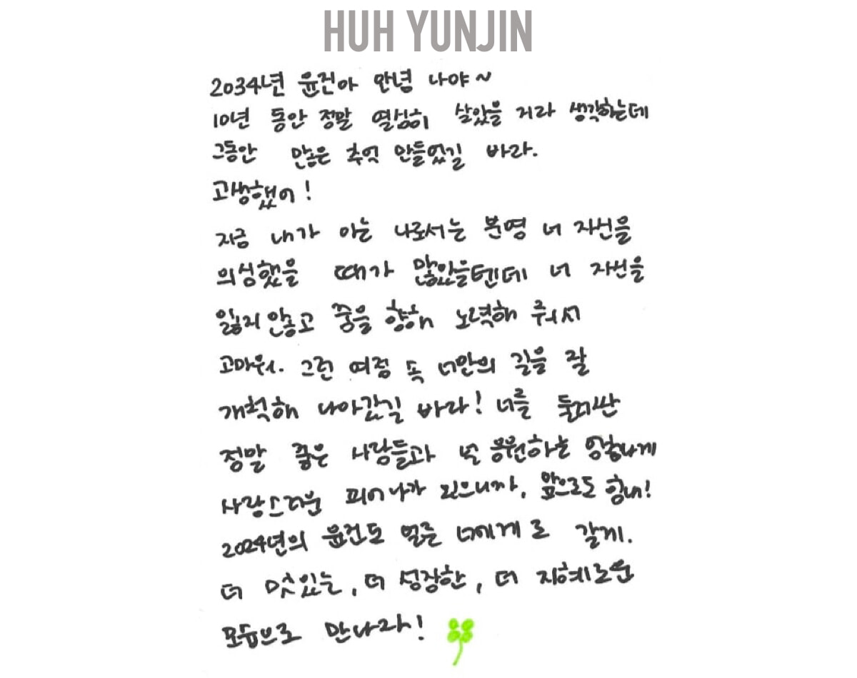 この10年間一生懸命頑張って過ごしてきたと思うけど、たくさんの思い出ができていたらいいな。本当にお疲れさま! いまの私からすると、自分自身を信じられなくなる時もあったはずなのに、自分を見失わずに夢に向かって努力してくれてありがとう。そんな人生という旅の中で、自分だけの道を切り拓いてくれていたらいいな。あなたのまわりにいる素晴らしい人たちとあなたを勇気づけてくれる愛しいFEARNOTのために、これからも頑張ってね。2024年のYUNJINが早くあなたのもとへ行くよ! もっと素敵で、成長した、良い姿で再会しようね!