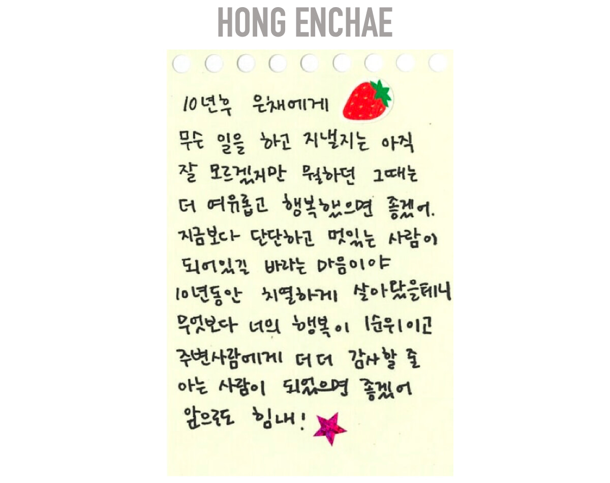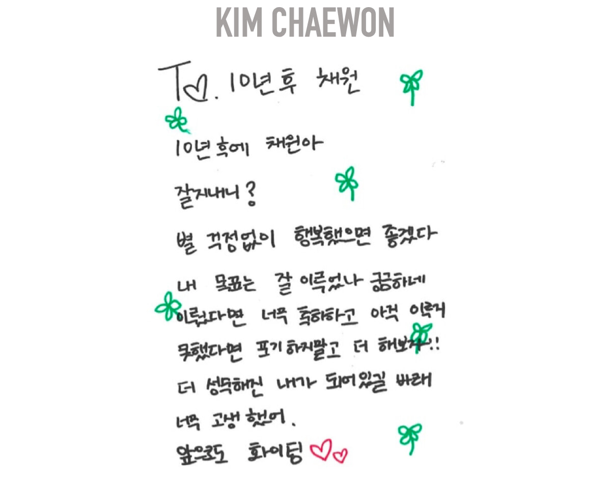 10年後のCHAEWON、元気にしてる? 何の心配事もなく、幸せに過ごしていてほしいな。私の目標は達成できたかな? もし、達成していたら本当におめでとう! まだ目標に届いていなければ、諦めずに挑戦を続けてね。もっと成長した私になっていることを願っているよ。本当によくやってるよ。これからもファイト!