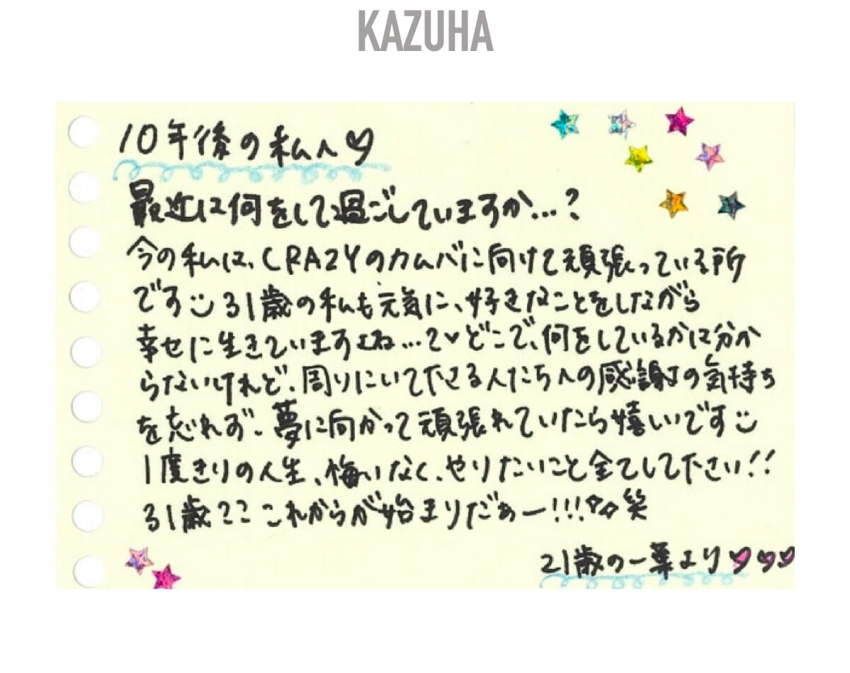 何をして過ごしているかはまだ想像ができないけれど、何をしていてもゆったりとした気持ちで幸せを感じていてほしいな。そして、いまよりもしっかりとした素敵な人になっていてほしいな。10年間一生懸命に過ごしてきたのだから、何よりも自分自身の幸せを最優先にして、まわりの人たちにより一層感謝することを忘れない人になっていてね! これからも頑張って!