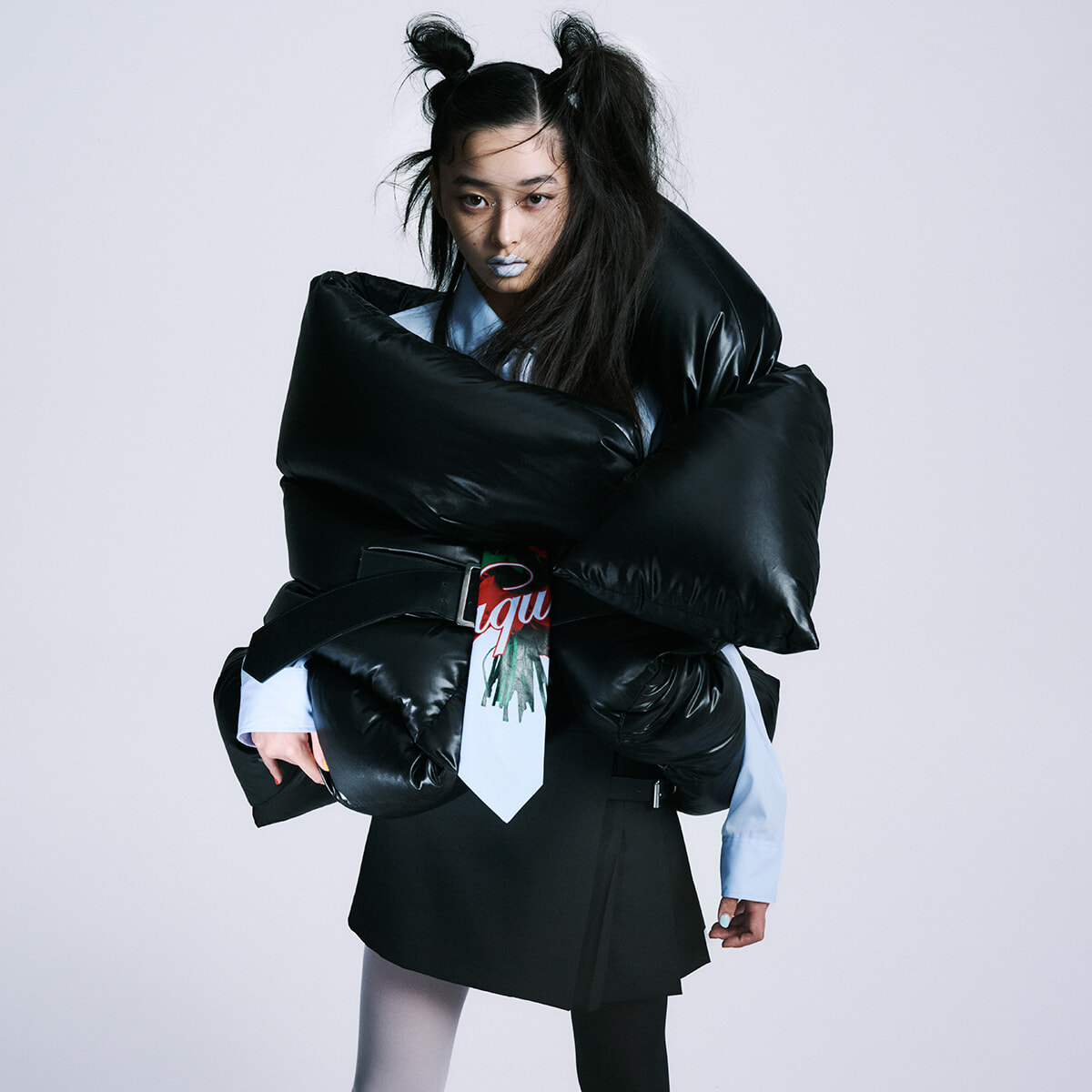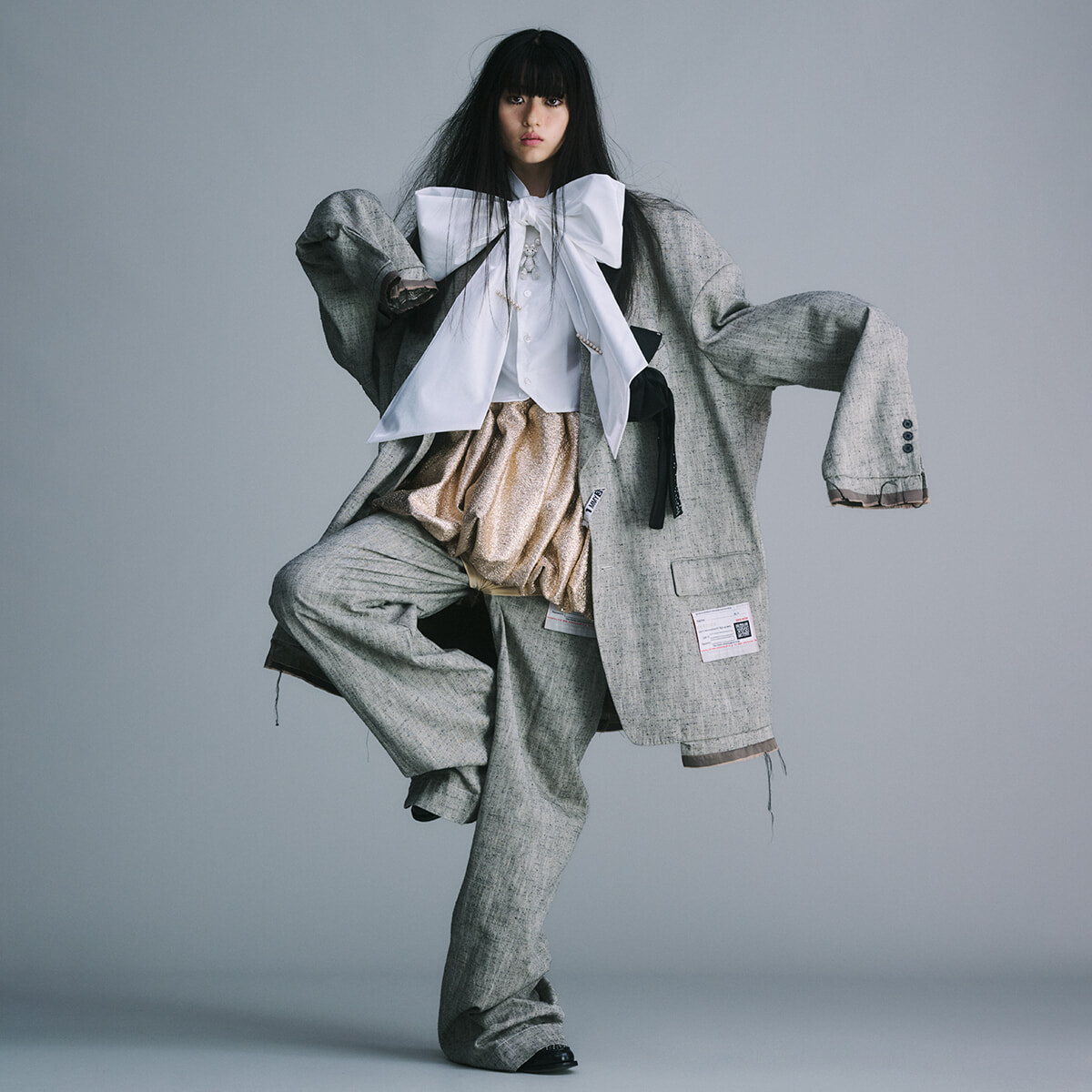 「見ると思わずワクワクしてしまうもの、それがボリュームシルエット。私がスタイリングを組む時に欠かせないシルエットで、あえてサイズを合わせないことも。おもちゃを与えられた子どものような感覚というか、一目見て想像力を掻き立てられるように気分が高揚する瞬間がファッションには必要だと思っていて。滝口さんとは初対面だったのですが、15歳ならではのピュアな透明感とまっすぐな一面を表現したくて、スクール要素をミックスしました」(山本マナ)