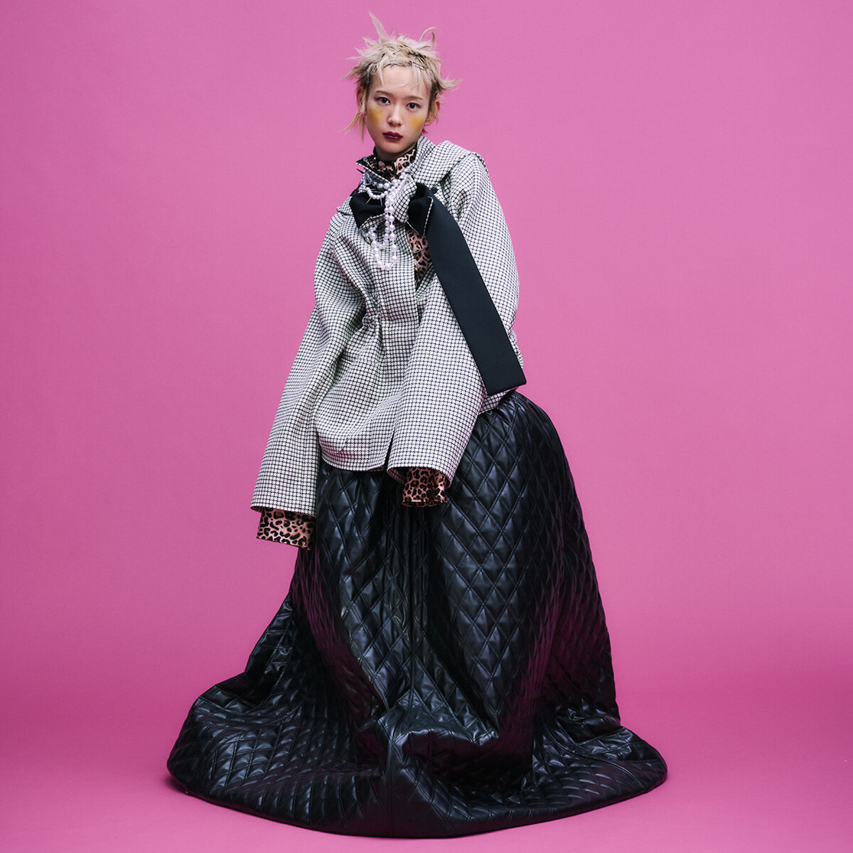 「どこか、アンバランスな部分を感じさせることもスタイルを作る時に意識します。実はレオパード柄が好きで、たくさん持っているのですが、着るならオーバーサイズやワンピースに合わせたりとカジュアルにしたり、品良くトラッドなアイテムと合わせたい。ならば、シルエットやヘアメイクでキッチュな反骨精神を表現する。フォルムや柄合わせも含めてアンバランスな二面性を意識するのが私的ルールのひとつです」(山本マナ)