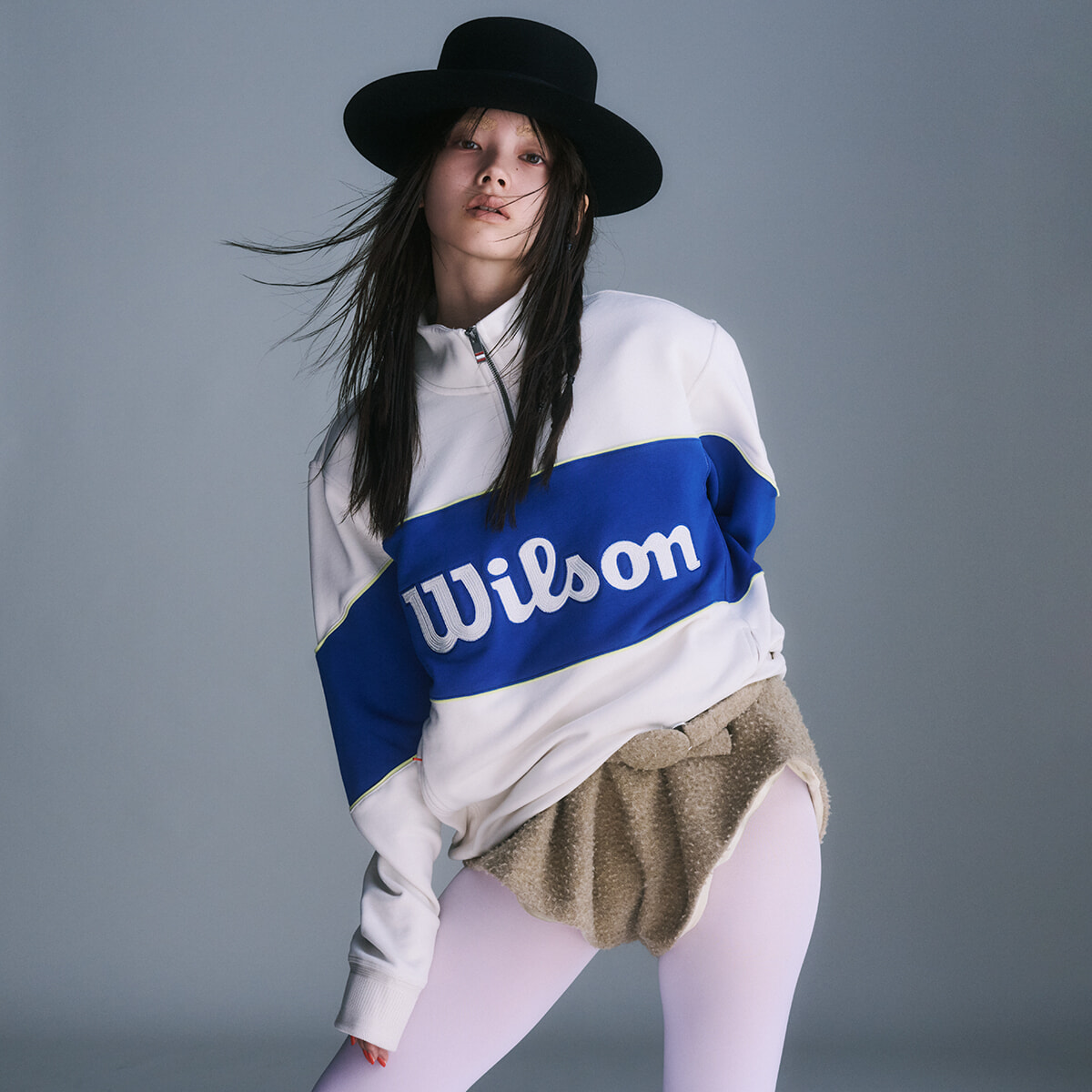 「昔からスウェットに目がなくて、今回はウイルソンのプルオーバーをピックアップしました。スウェットを着る時にはサイズ感や質感のコントラストを大切にしていて、同じ素材を合わせないと決めています。たとえばジャージを着る時はレーススカートやカラータイツ、ブルマのようなショート丈パンツをはいてアイテムのイメージを崩していくことで、日常に溶け込みすぎない違和感を演出します」(山本マナ)