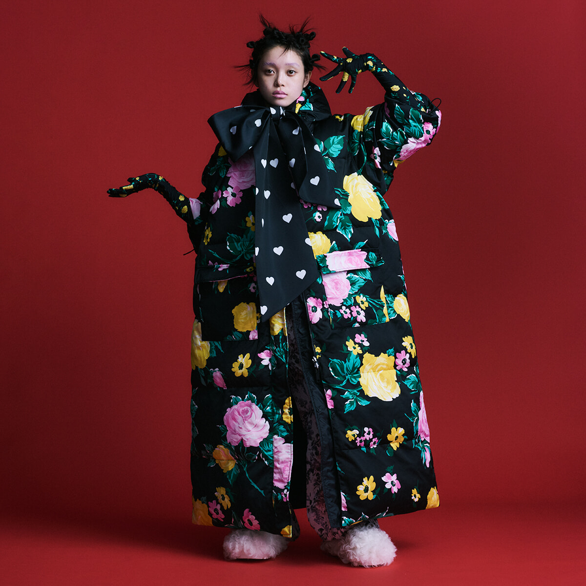 「柄と柄の合わせには、人を感動させるサプライズがあると感じます。気持ちを高揚させるツールでありながらも、合わせ方次第でシックにも装える。だから柄と柄、色と色といったインパクトのあるものをミックスする時こそ、繊細にバランス感覚を研ぎ澄ませて組むようにしています。ベースのカラーをダークトーンで抑えて、繋ぎの色にして。ここでもボリューム感や異素材同士の掛け合わせが全体のバランスを整える手助けになるんです」(山本マナ)