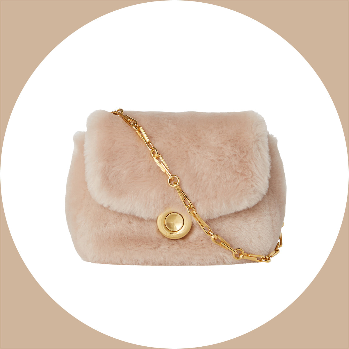 ふわふわのベビーピンクを纏うロロ・ピアーナのバッグ「ギエラ」。小ぶりなサイズに、ゴールドのチェーンストラップとメタルバックルの組み合わせがロマンティックなムードを演出。ホリデーシーズンにも活躍してくれそう。