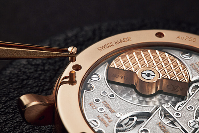 このモデルを仕立てているのは、スイスにある自社のウォッチメイキングアトリエ、ラ・ファブリク・デュ・タン ルイ・ヴィトン。高度な技術を持った職人たちが集結しているので、細部のほんの小さな部分にいたるまで丁寧な仕事がなされている。ウォッチを裏返してみると、輝くような仕上げを施したムーブメントが見える。ジュネーブにある検定機関の厳しい検査をパスしたムーブメントを搭載しているので、精度の高さは折り紙つきだ。