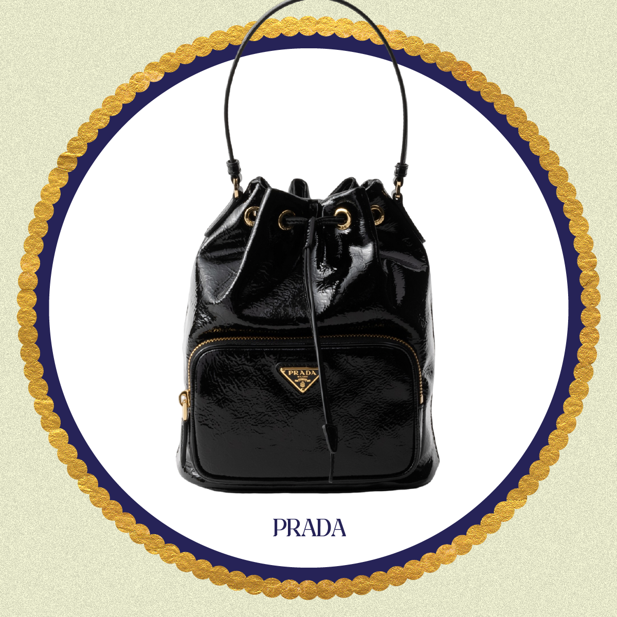 光沢感のあるコケティッシュなバケットバッグは、秋冬のスタイリングを洗練された佇まいへと導く。調節可能なレザーのショルダーストラップ付き。「現代的なデザインと、パテントレザーの質感のバランスに一目惚れしました」