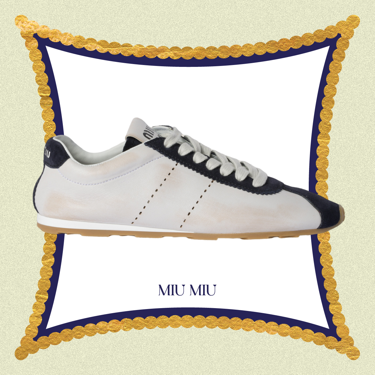 ミュウミュウロゴがチラリと覗くスニーカーは、デニムやロングスカートに合わせたい。ほんのりヴィンテージ感を加えることで洒脱な印象に。「スニーカーはスニーカーでも、ミュウミュウのスニーカーはやっぱり特別! デートで履きたい!」