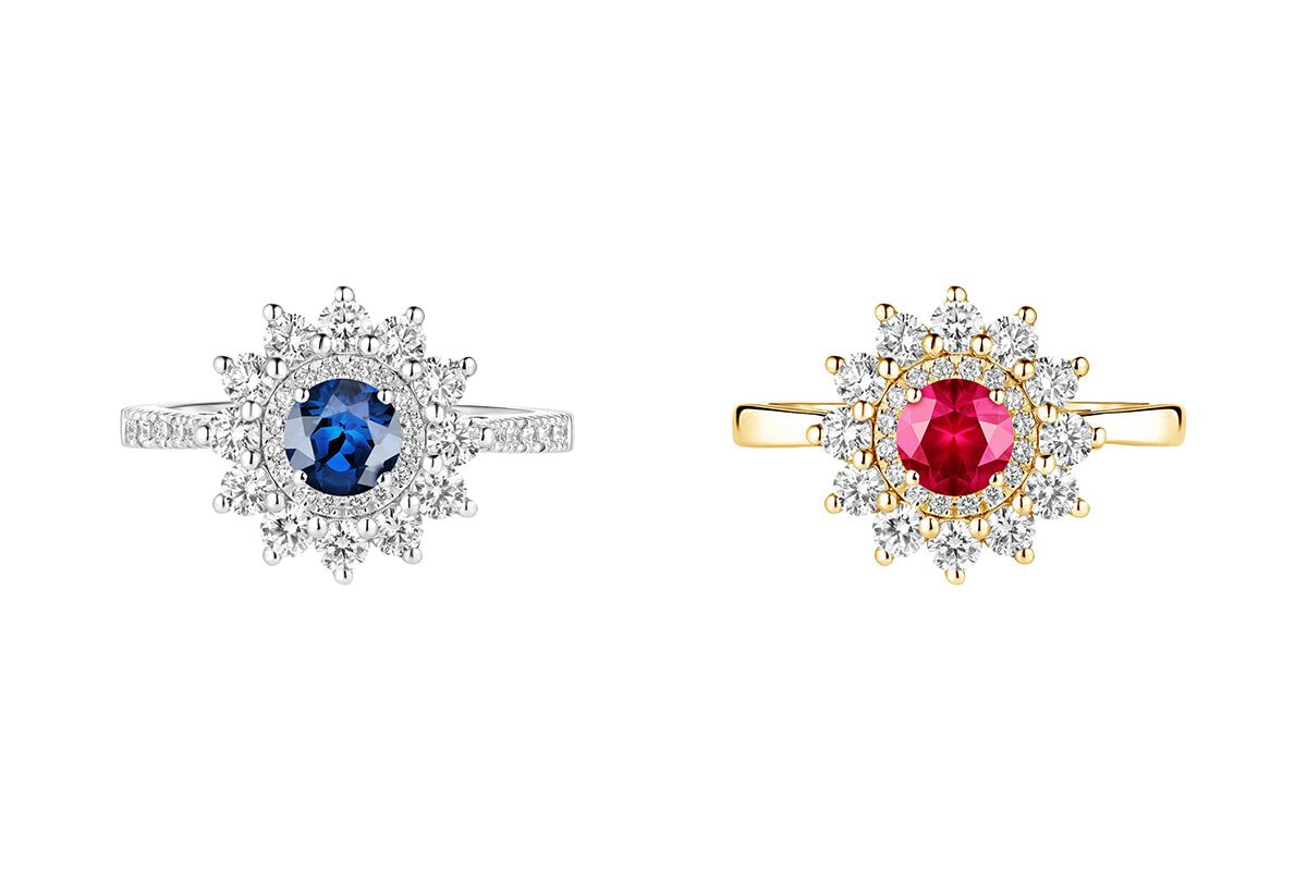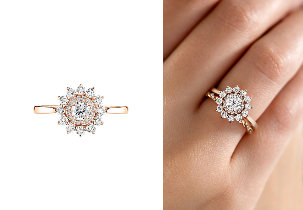 デイジーの花と太陽にインスパイアを受けてデザインされた「レフコス」。エーゲ海に面したギリシャの村の名前に由来するコレクション名のとおり、メインストーンをぐるりとダイヤモンドの白い輝きで囲むことで輝きと煌めきが美しく調和し、太陽がふたりの未来を祝福しているかのように感じられる。石を留める小さな爪の先端を丸く磨くことで日常生活の中で引っかかることがないよう細やかに配慮されているのもうれしい。