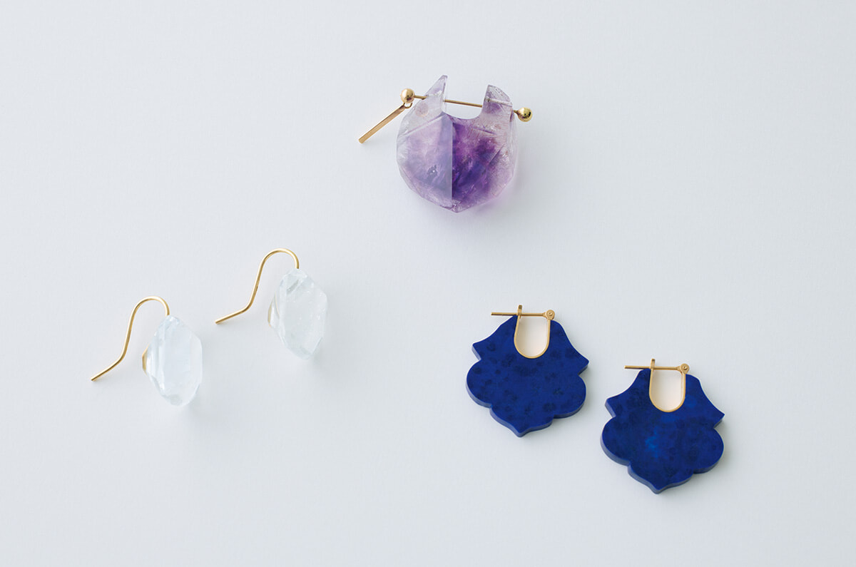 日本人デザイナーのブランドのピアスたち。透明感のある淡いブルーのピアスはエツコソノベのもので、石はアクアマリン。アメシストのシングルピアスはモナカのもの。紫の部分と水晶の透明な部分が混ざりあっていて石としても魅力的。オリエンタルなデザインが気に入ってよく着けているトーカティブのピアスはラピスラズリ。