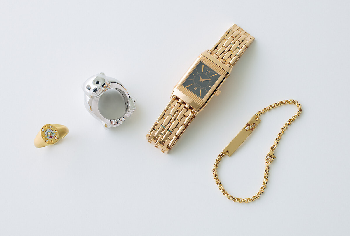 左上は最近購入したシシジュエリーのリング。エナメルで描かれた絵が愛らしい。身に着けていると必ずと言っていいほど聞かれて、コミュニケーションの起点となってくれるショパールのくまのリング。30年以上メンテナンスをしながら丁寧に使ってきたジャガー・ルクルトの名品レベルソ。ショーメのブレスレットはゴールドで手元をまとめたい時にも重宝。