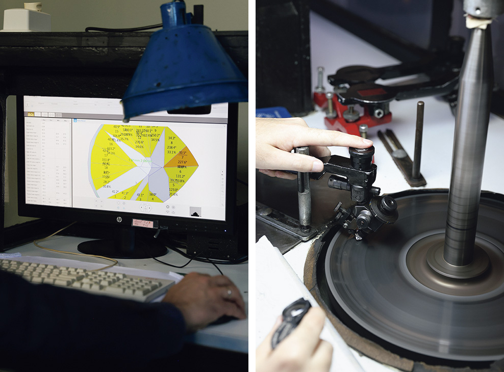 原石の持つポテンシャルを最大限に引き出すという信条は170年前の創業以来、微塵も変わることはない。しかし職人の勘と腕任せだったカリナンの時代からは飛躍的に前進し、現在は精緻な美しさのためにコンピューターによる最新技術を導入してカット、研磨を行っている。それでも最後に頼りになるのは職人による確かな技術だ。肉眼では判別しきれない極小の僅かな曇りをスクリーン上で見つけ出し、ベテランたちが時間をかけて丁寧に磨きをかける。そうすることでロイヤル・アッシャーの代名詞とも言える、非常に高い透明感とまばゆいばかりの輝きを持つダイヤモンドが生まれる。