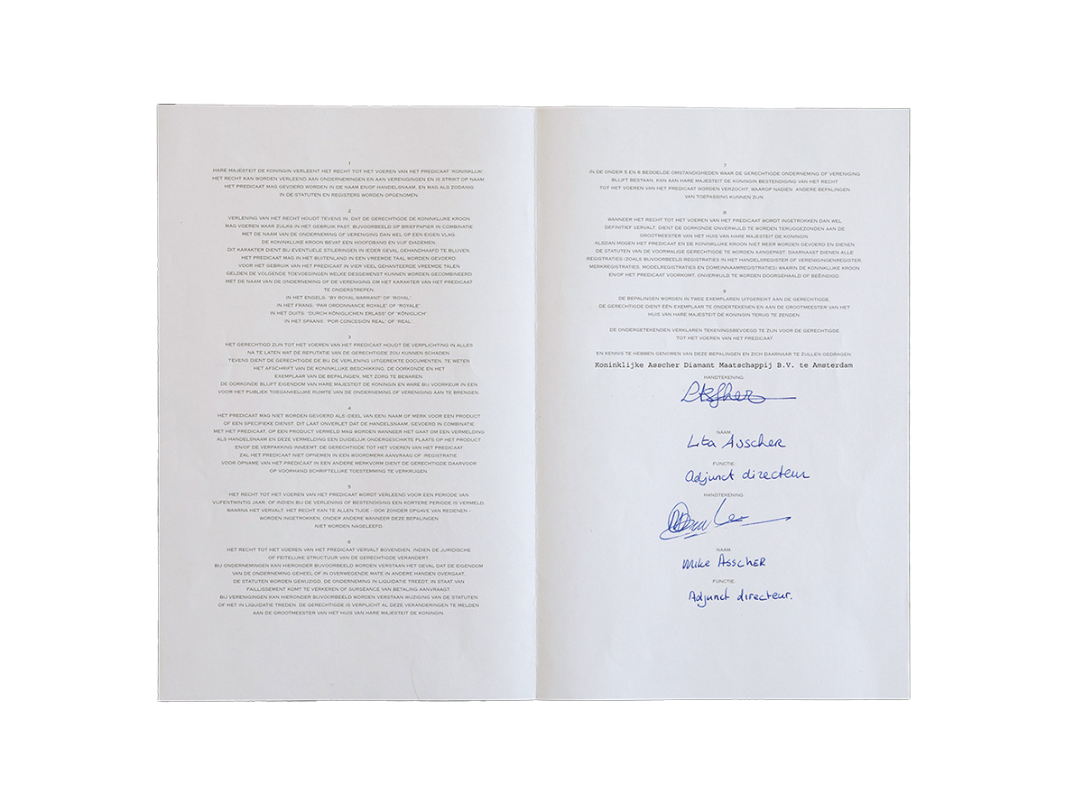 本社のすぐ前にディアマントストラートの標識を見つけることができる。1854年に当時すでに高名なダイヤモンド職人だったジョセフ・アイザック・アッシャーにより創業。1908年には3代目ジョセフ・アッシャーが、南アフリカで発掘後にイギリス王室に献上された3106カラットの世界最大のダイヤモンド原石、カリナンのカットを任され見事に成功。カットされた9つの大きなダイヤモンドのうち最大のカリナンⅠ世は王笏、2番目に大きなカリナンⅡ世はインペリアル・ステート・クラウンへ組み込まれ、昨年のチャールズ国王の戴冠式でこのふたつの巨大なダイヤモンドは、カミラ王妃の頭上で輝く王冠を飾ったカリナンⅢ世、Ⅳ世、Ⅴ世とともに大きな注目を集めたことは記憶に新しい。オランダ王室からは1980年と2011年の2度にわたり「ロイヤル」の称号を授与されて、名実ともに最高峰のダイヤモンドジュエラーとしての地位を築いている。