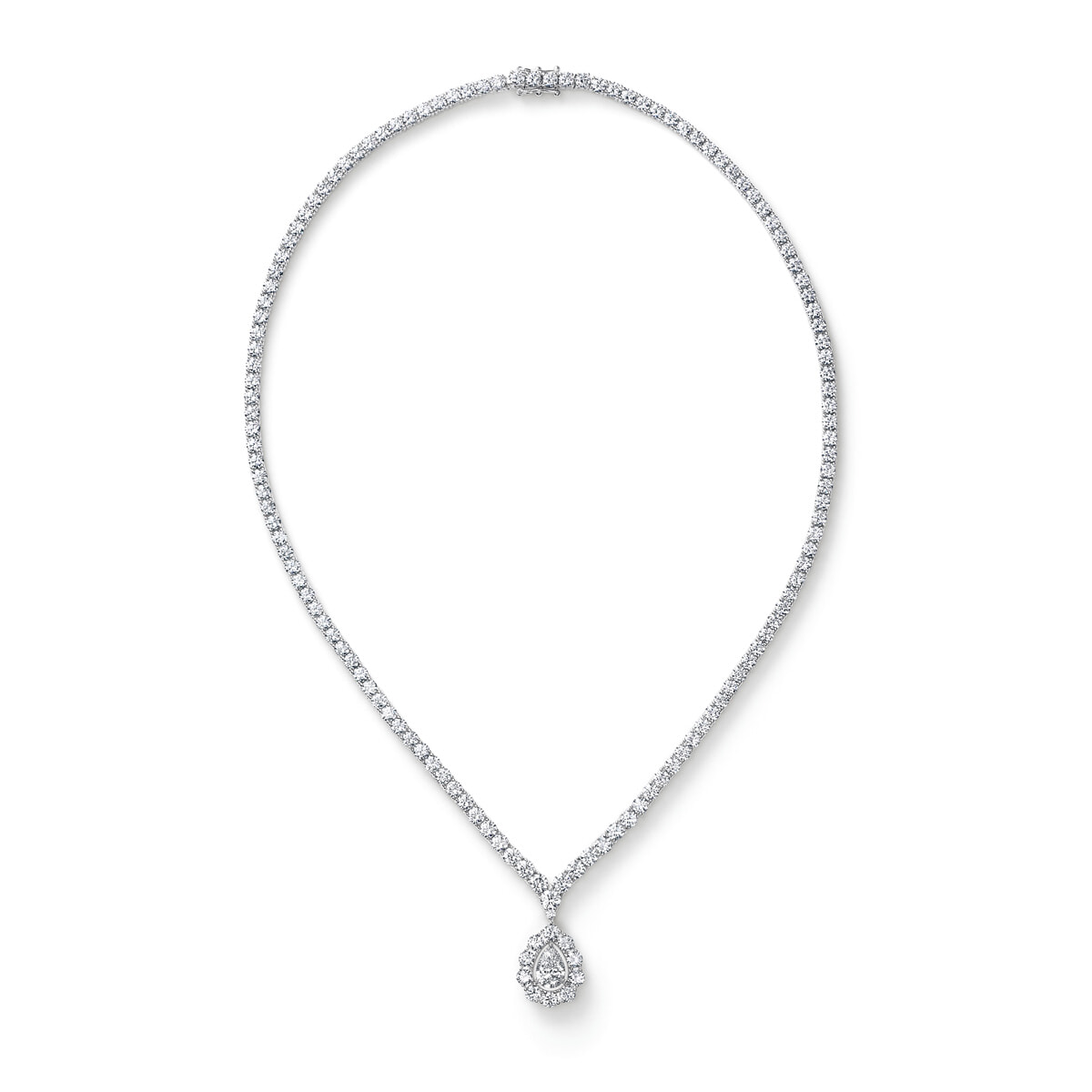 この秋、ロイヤル・アッシャー・シグニチャーカット コレクションから新たなオリジナルのダイヤモンドカットが登場! マイク・アッシャーが考案した「ロイヤル・アッシャー・ペアシェイプカット」は、一般的な55面体のペアシェイプカットの、クラウン側に11面、パビリオン側に10面をプラスした76面体だ。煌めきを最大限に引き出しつつスタイリッシュでモダンな輝きを約束してくれる。これまでの4つのオリジナルカットに続く5つ目の国際パテントを持つカットであり、創業以来受け継いできた「ダイヤモンドを最も美しく輝かせたい」というアッシャー・ファミリーの情熱の集大成とも言える。新作のボリュームネックレスはトップに向かって緩やかに大きくなっていくダイヤモンドのグラデーションの先に葉先からこぼれ落ちた一粒の雫をイメージした1ctのダイヤモンドがゴージャスに輝く。ペンダントは葉や花を連想させる4石のマーキースカットの先端で印象的に。「ロイヤル・アッシャー・ペアシェイプカット」だけが持つ洗練された究極の美を堪能したい。