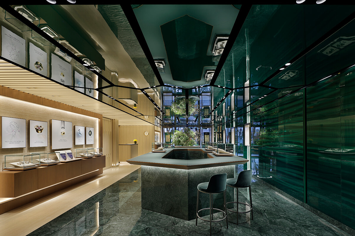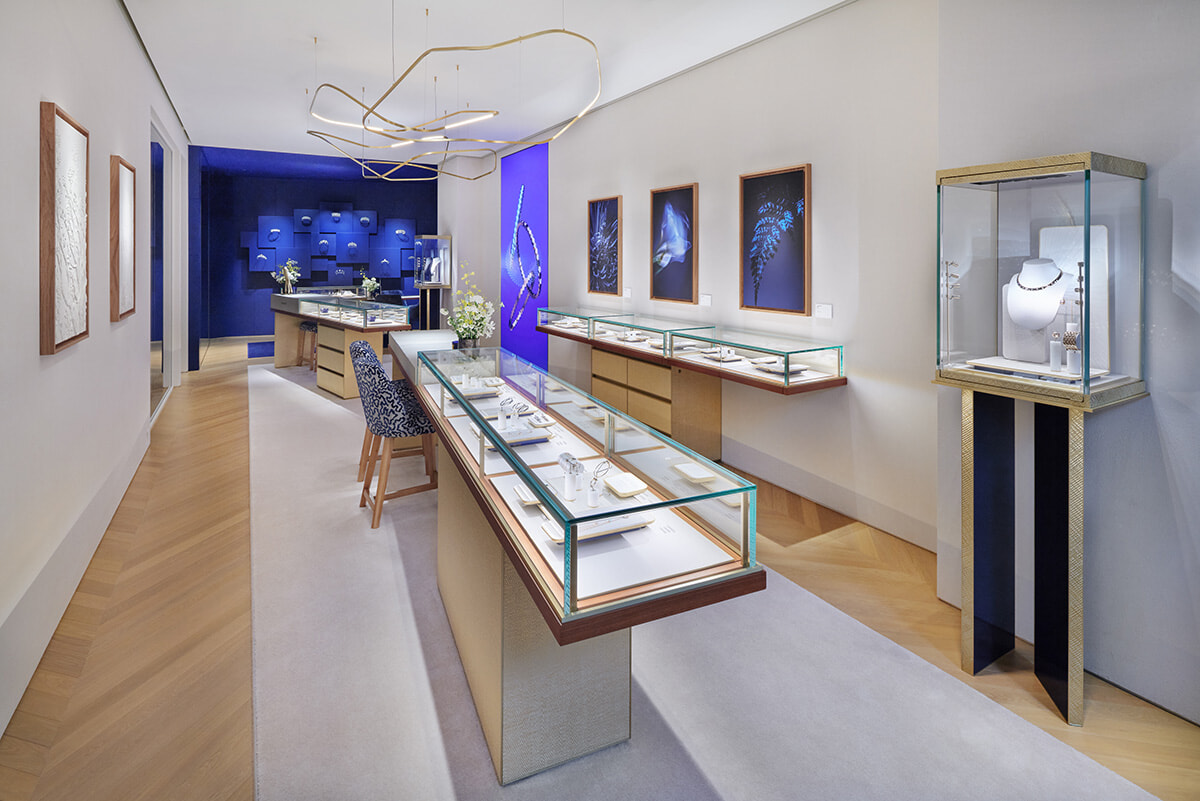 3Dアニメーションを手がけるフランス人とトルコ人のディレクターデュオ、ビュルキュ&ジョフレによるアートワークでポエティックなアルハンブラの世界観を体感できるブティック。ミュージアムを思わせる2階では歴史やサヴォワールフェールの紹介や貴重なアーカイブピースの展示も見逃せない。ブルーアゲートをあしらったアルハンブラの新作も。