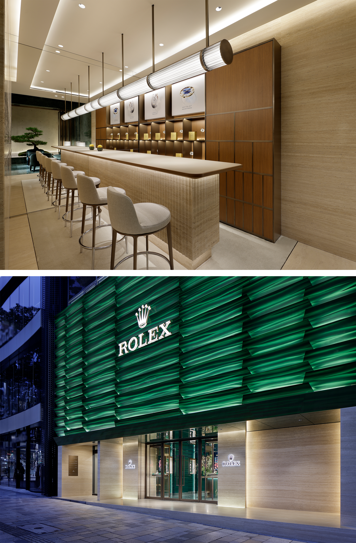 今秋、エリア初出店となるロレックス ブティック 表参道がオープン。けやき並木と調和する、シンボリックなフルーテッドベゼルのパターンをブランドカラーのグリーンでダイナミックにあしらったファサードが目を引く旗艦店だ。各フロアには個室もあり、豊富な知識を持つロレックス アドバイザーが顧客の多様なニーズに対応。サービスカウンターでは、ロレックス独自の高度なトレーニングを受けた技術者がアフターサービスに関する相談にも乗ってくれる。