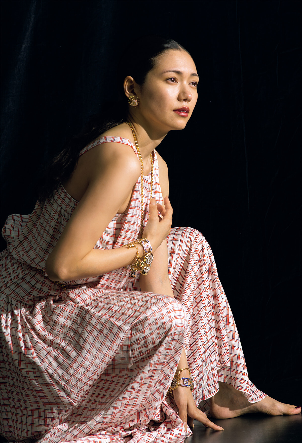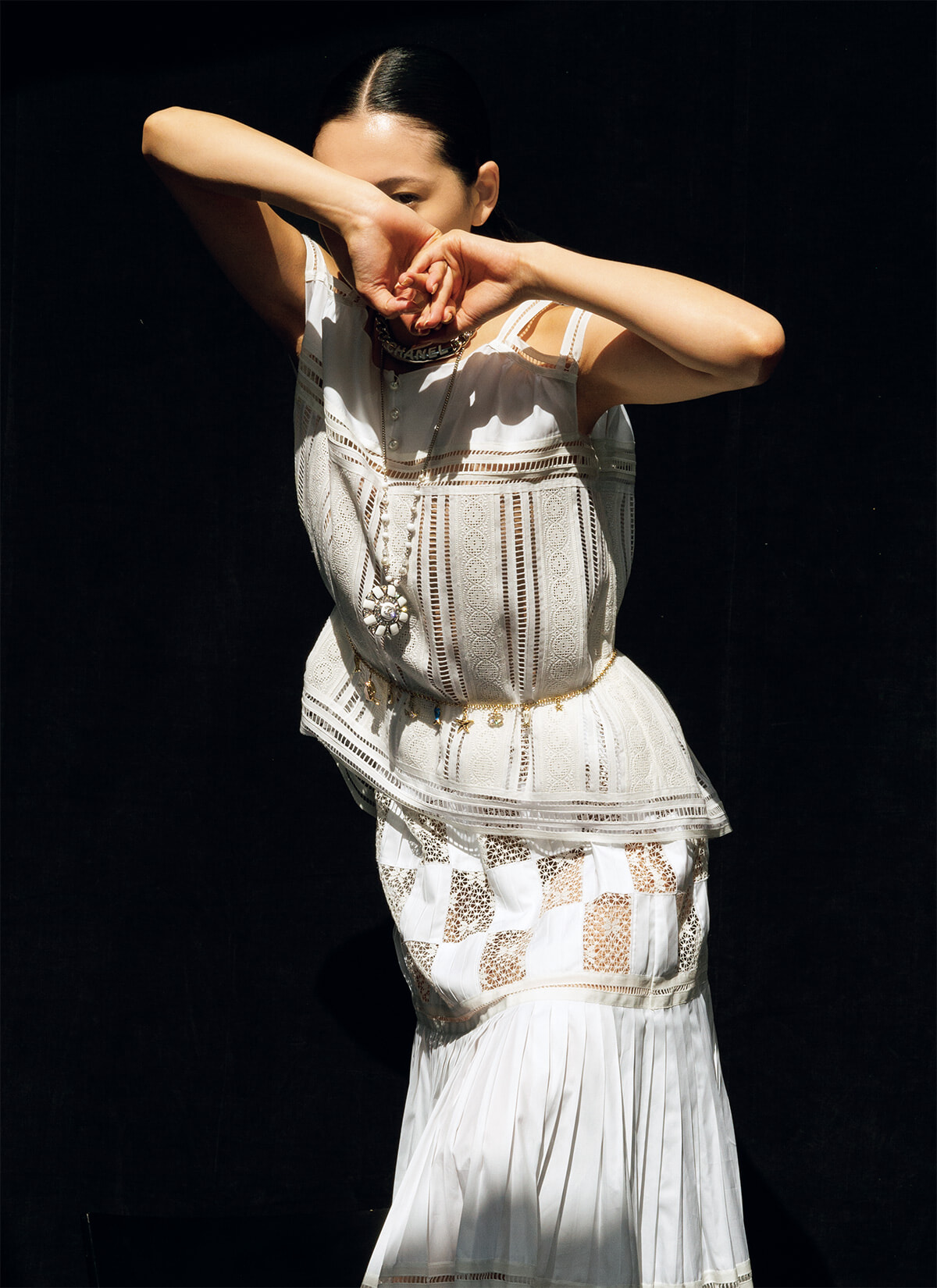 「シャネルの服は抑制的であり、規律的なものだと思っていたのですが、いざ袖を通してみたら、こんなにも動きを制限しないんだ! と驚きました。可動域が広く、動きやすく、心が解放されていくような服です。ガブリエル・シャネルのスピリットが生きていると感じました。女性のコルセットを外したということが能動的な動きに繋がっているのかもしれません。抑制された女性を解放し、時代に大きな影響を与えたパイオニアという存在です。私がこうして表に立つ仕事をできているのも、彼女の影響なのではないかと感じます」。身体の動作を制限することのない軽やかなドレスが、感情の昂りによって引き出された自由な動きを優しく包み込む。