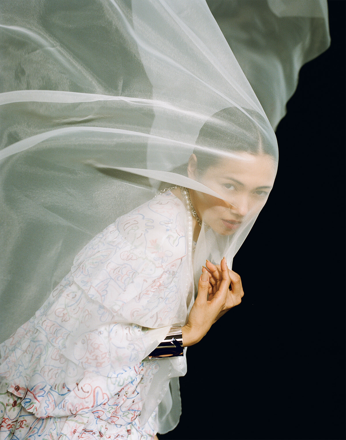 「私はもともとシャイな性格だし、自分のテンションを上げないと場に呑まれるんです。ヘアメイクの力を借りてシャネルの服を纏った完成された姿で、そこから自意識を脱ぐという今回の作業はとても楽しかった。芝居をするとか演じることは想像以上に繊細な作業で、湿度が1 パーセント違うだけで、すべてが違うような気がするんです。今回の撮影を経て、自分に対する新たな課題も発見できました」。グラフィカルなタッチで描かれた海の生き物がプリントされた波打つラッフルのドレス。繊細なドレスとチュールの隙間を、新しい風が吹き抜けていった。
