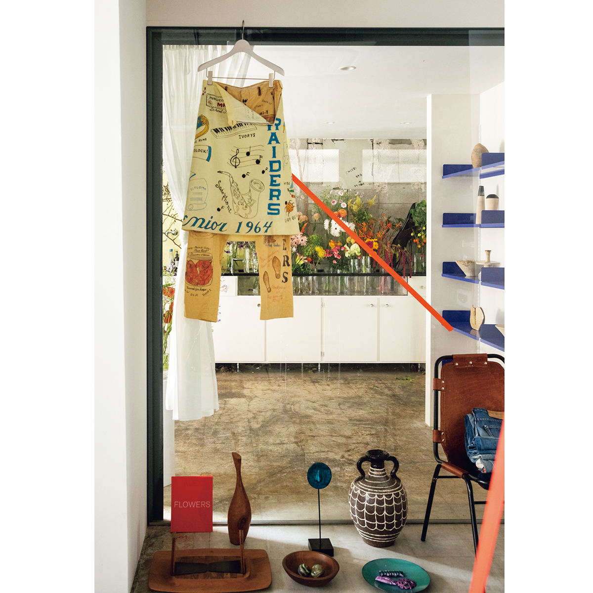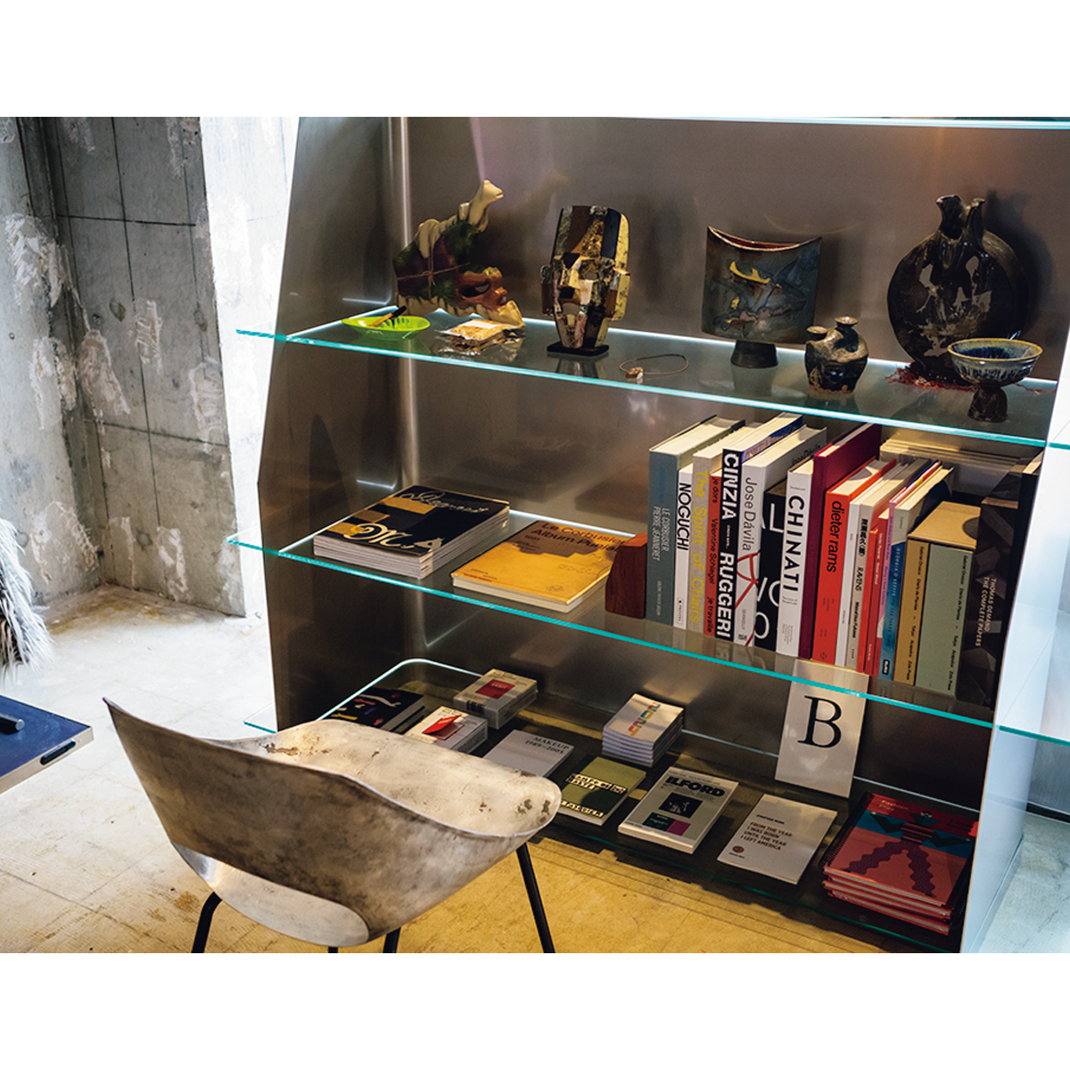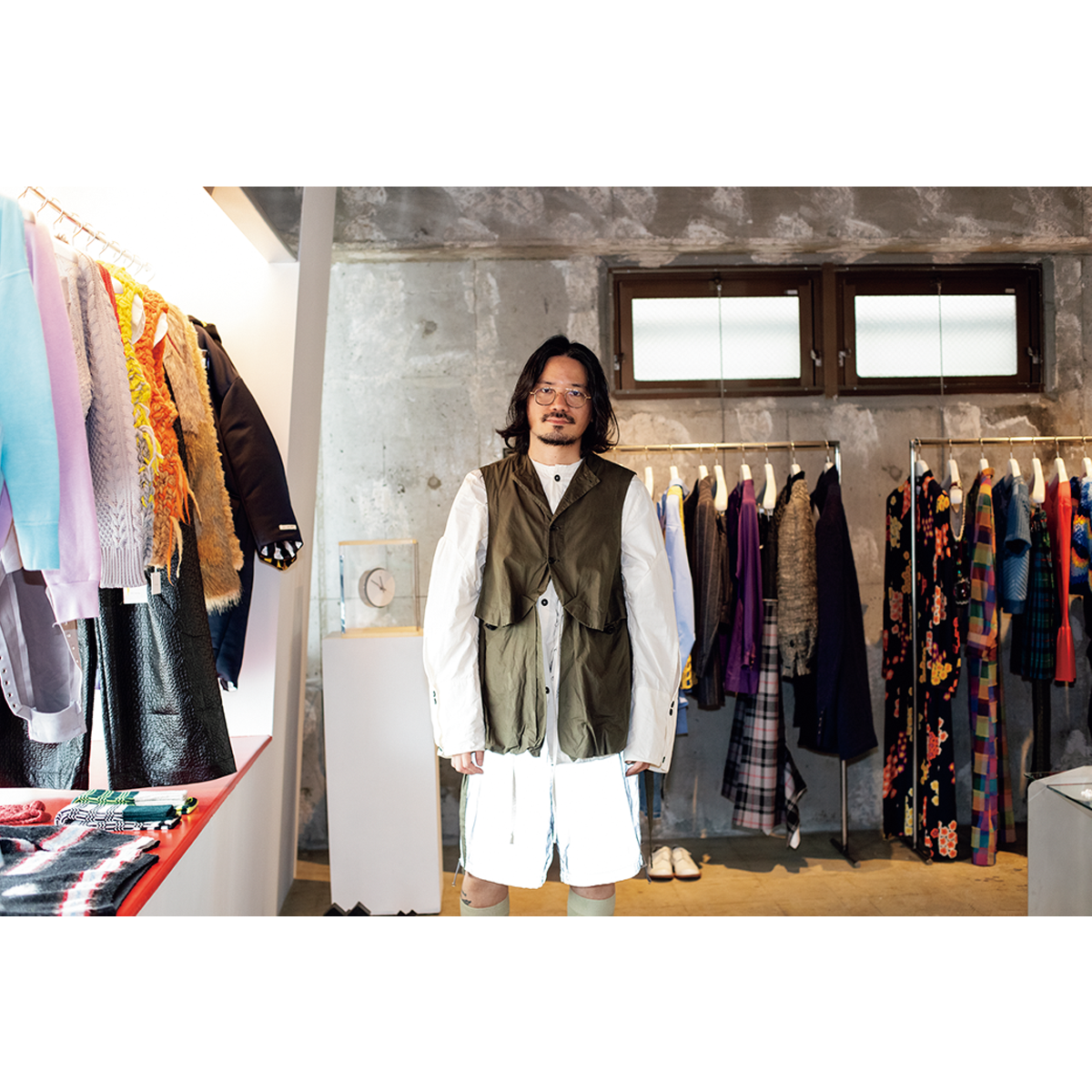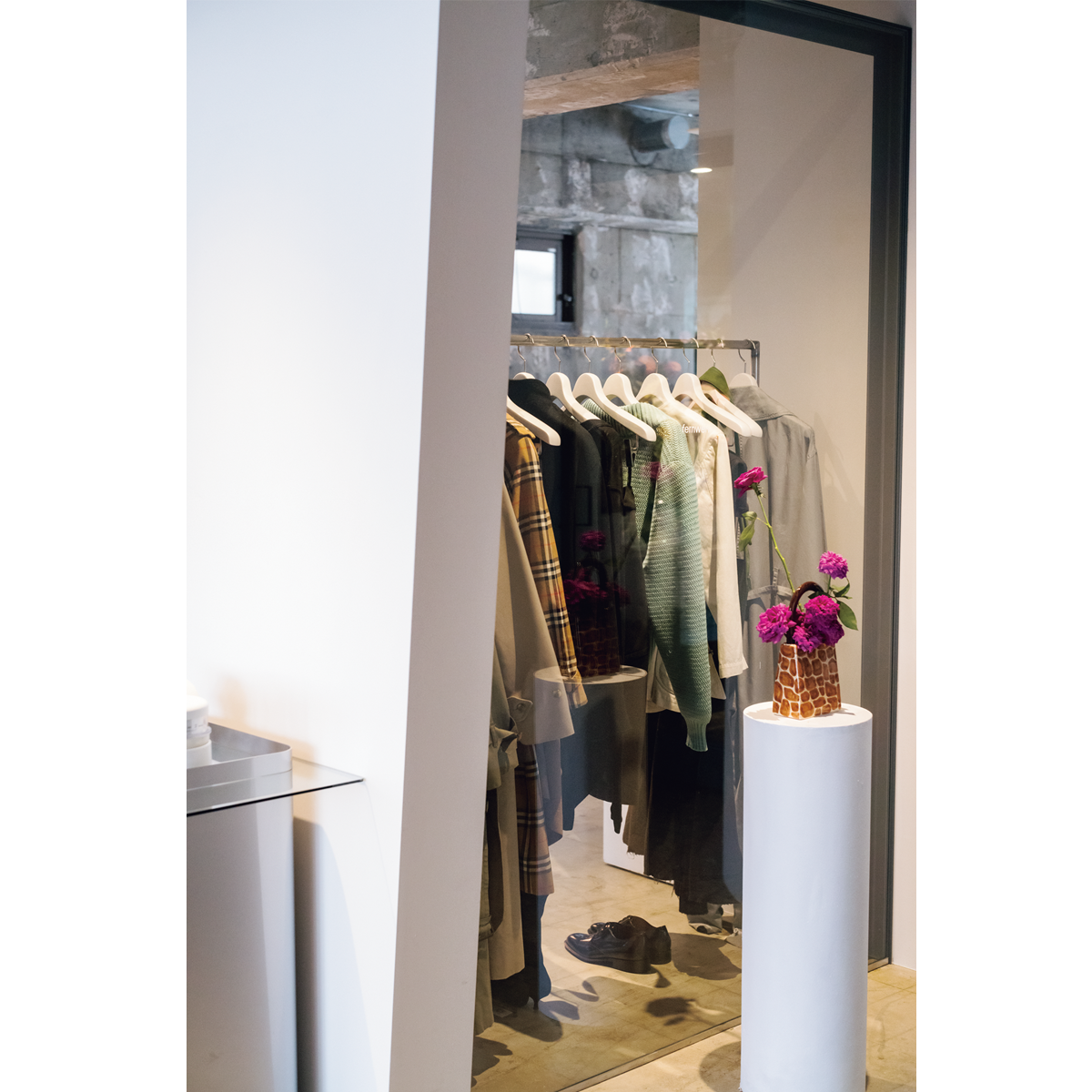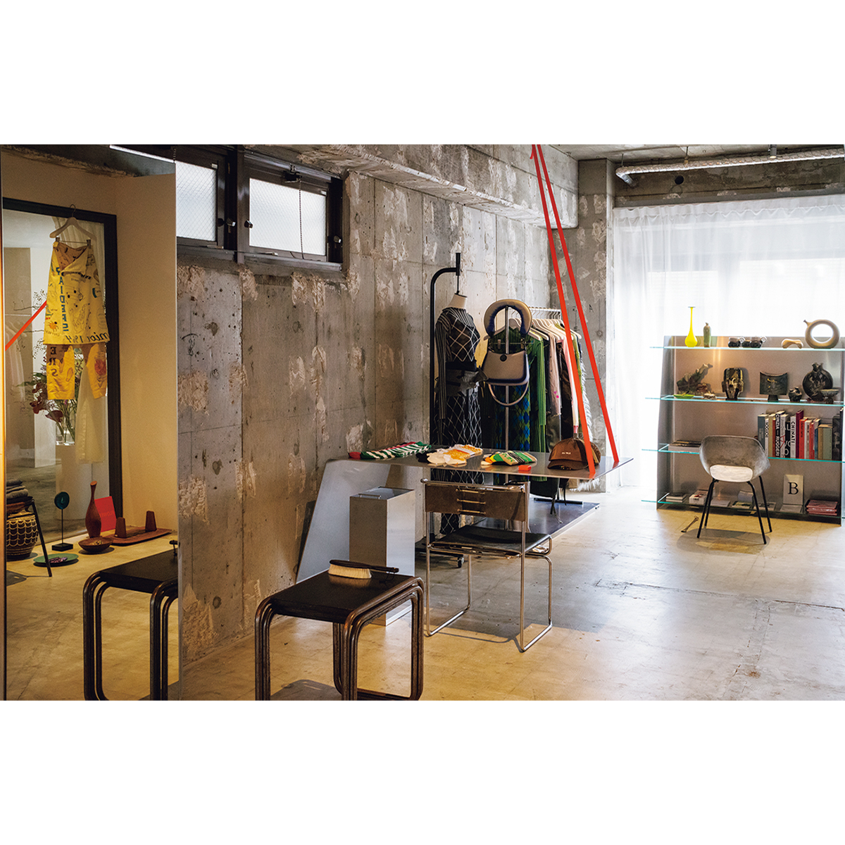 「ノイズが少ない場所にしたかった」と語る立地には、近年賑わう下北沢や世田谷代田、経堂に囲まれながら入れ替わりが進んでいない梅ヶ丘を選んだ。そして、溝口がこよなく愛するル・コルビュジエやヘリット・リートフェルトらのモダニズムに影響を受けた鋭角の柱と什器に囲まれた凛とした空間に、国内でも取り扱いが少ないジュリー・ケーゲルやパウラ・カノヴァス・デル・ヴァスを筆頭とした気鋭のヨーロッパブランドと、自らがアメリカで買い付けてきた1890年以降の、時にはジャンクなヴィンテージウエアが並ぶ。バイイングの基準は「ここでしか買えないもの」といたってシンプル。