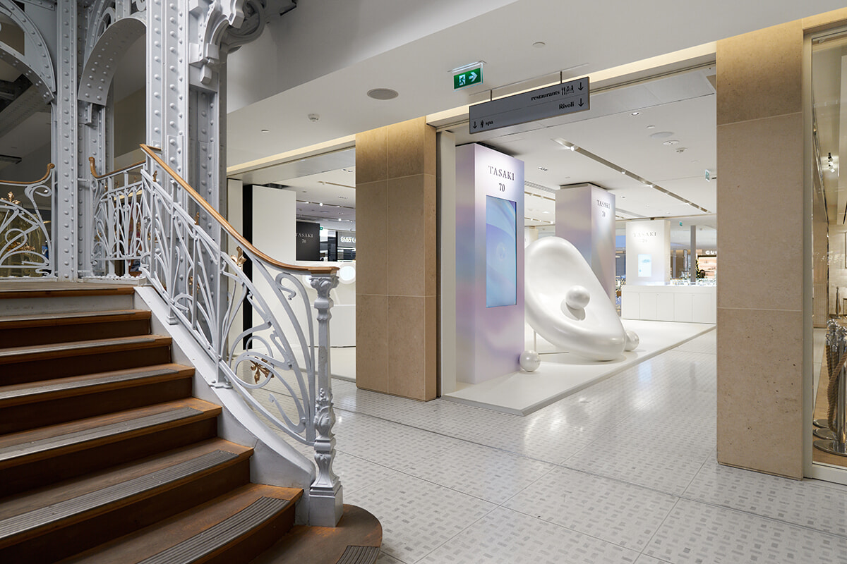 パリの舞台は、ポン・ヌフのたもとでセーヌを見下ろす老舗百貨店サマリテーヌ。アール・ヌーヴォー建築の美しい中央階段の隣に設けられた特設会場は、白く丸みを帯びたデザインで、まるで真珠母貝の中に包み込まれたような幻想的な空間だ。