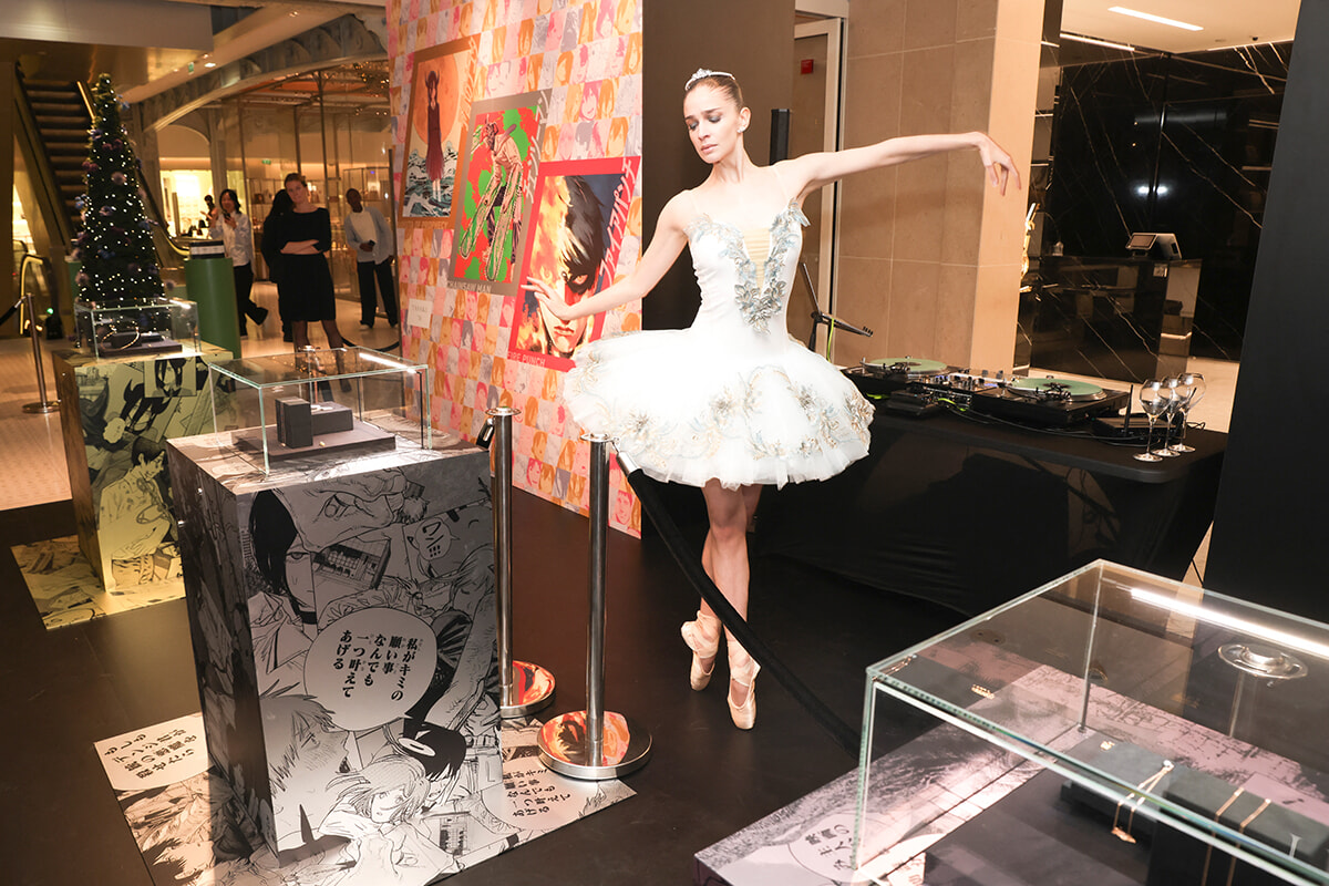 エキシビションを盛り上げたのは、日本を代表する漫画クリエイター、藤本タツキの『チェンソーマン』『予言のナユタ』『ファイアパンチ』3作にちなんだコラボレーションジュエリー。チェンソーの刃をパールで表現したペンダントやイヤーカフ、ナユタのツノを持つ頭を彷彿させるホーン付きリングなど、アニメーションが広く浸透しているフランスでも注目を集めた。