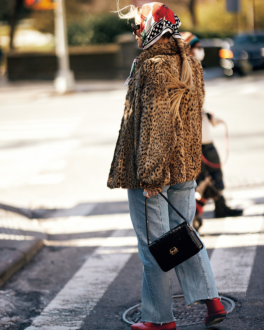 柄モノを気負いなく着るには、デニムやアクセサリーで工夫。