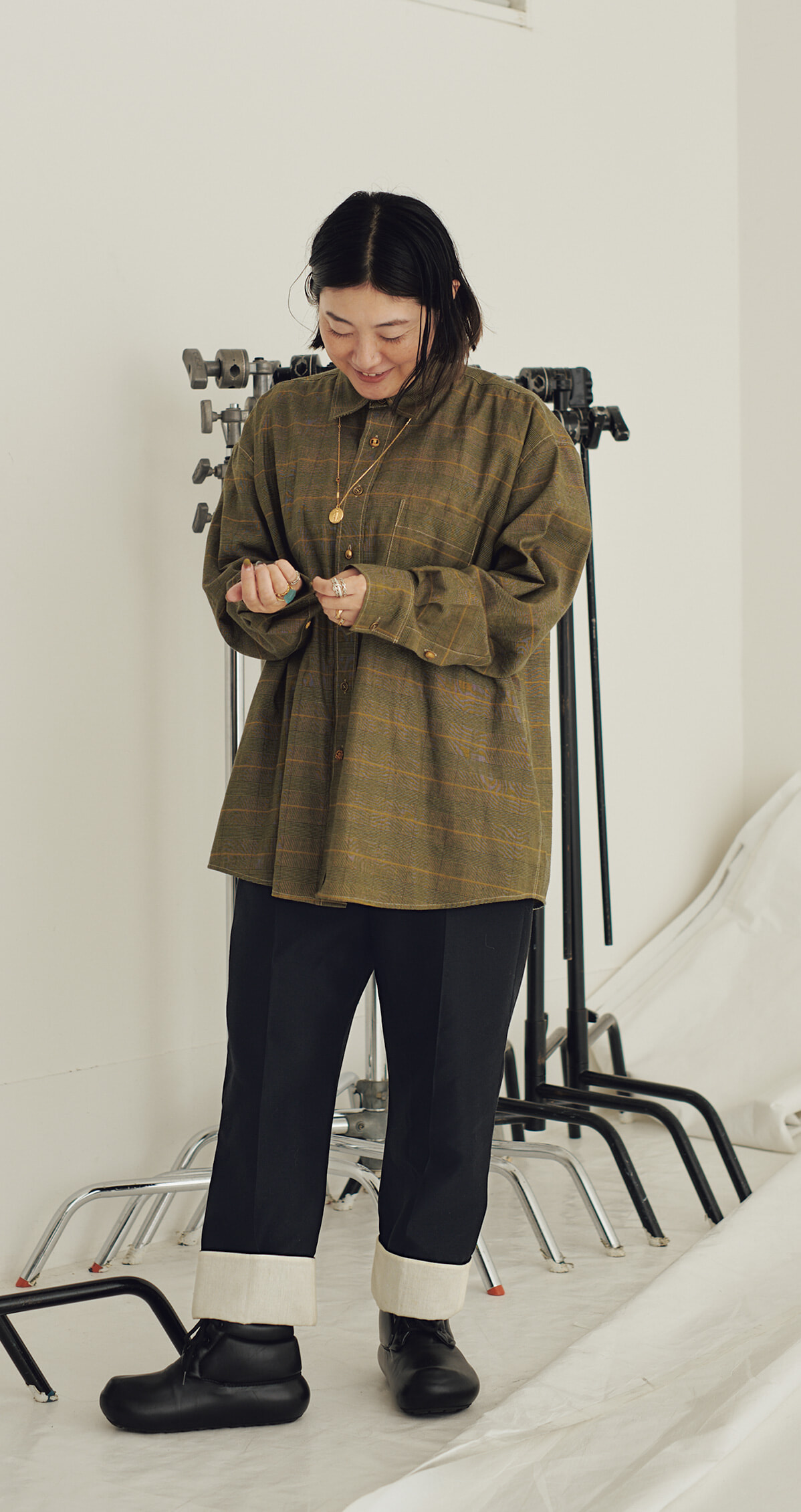 少し前に仕事で韓国を訪れた際に買ったシャツはレクトのもの。ユニセックスブランドらしいベーシックなデザインと、ボタンひとつひとつのデザインが異なる気の利いたディテールがお気に入り。パンツはフィービー・ファイロ時代のセリーヌで、シューズはジル サンダー。ハイメゾンとアップカミングな韓国ブランドを合わせるのも丸山らしい。