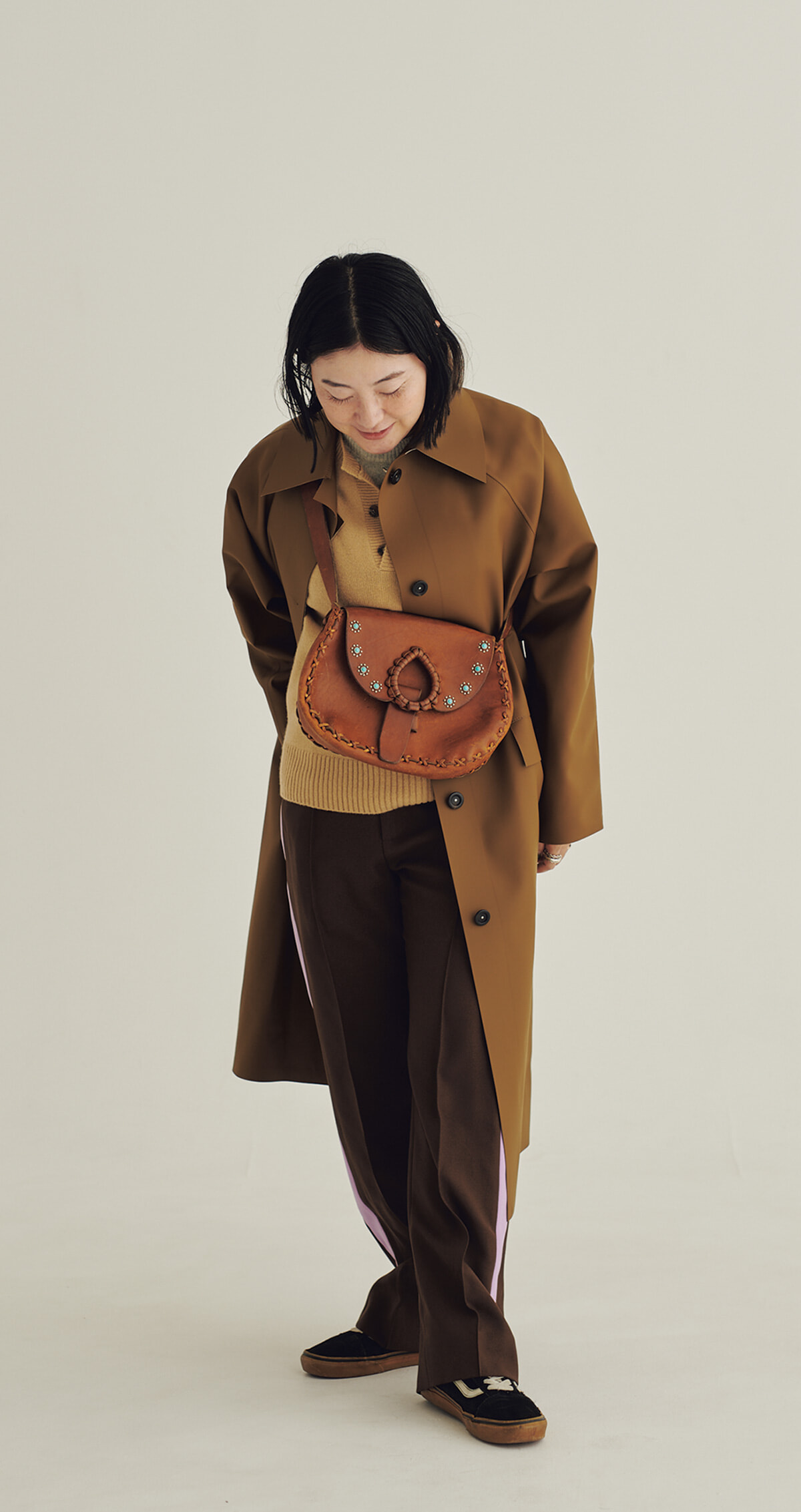 撮影にリースにと一日中動き回ることもしばしば。そんな日は動きやすさを最優先。モード感漂うカッスル・エディションズのコートはラバー製で、シワにならず雨も弾く優れもの。ジャージーパンツはグッチのメンズ。まったくテイストの異なるウエスタン調のレザーバッグを合わせても、全身をワントーンでまとめているため自然とマッチ。