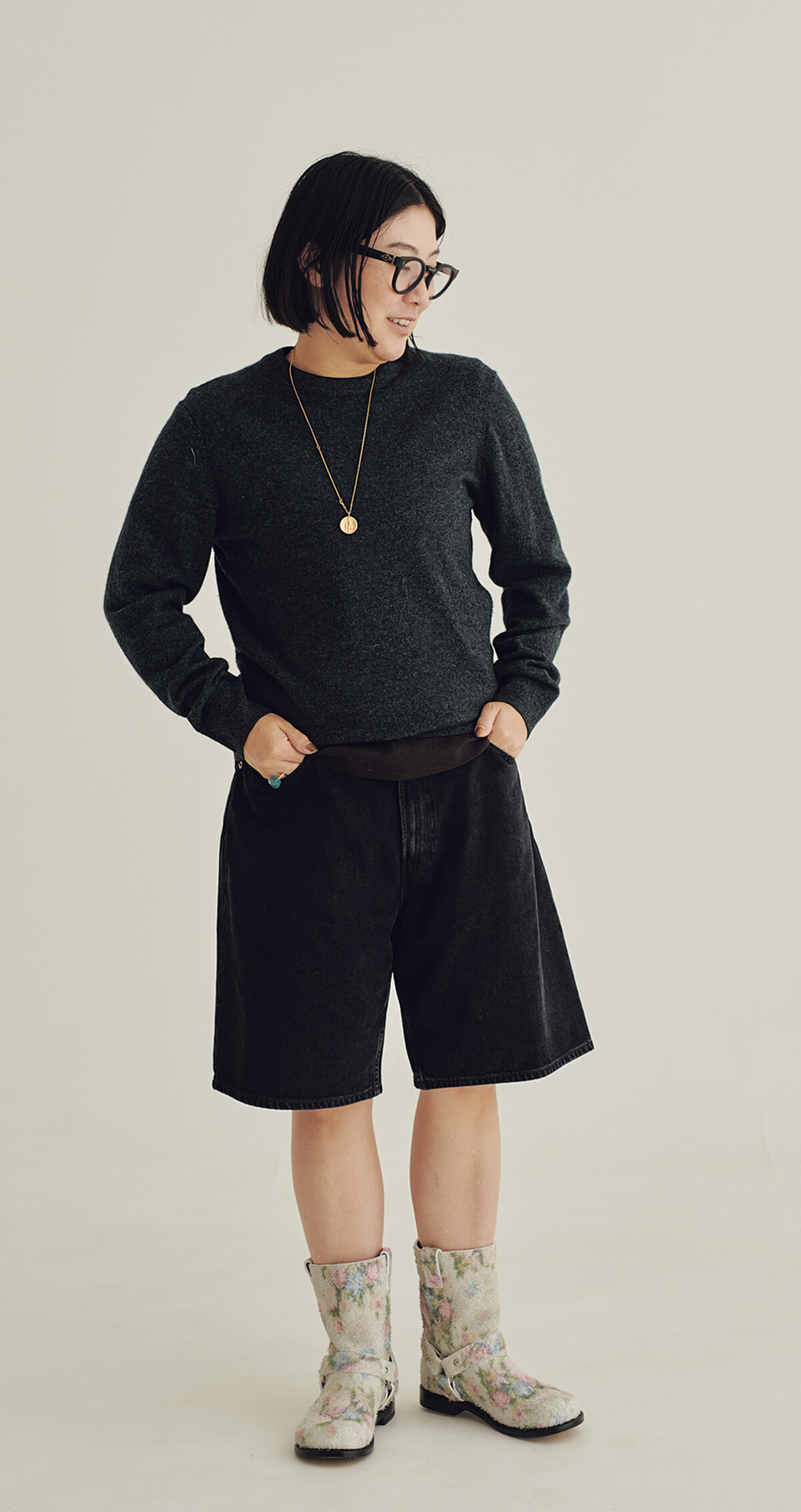 「フィガロジャポン」10月号の「大人の新ベーシックAtoZ」でリコメンドしたロエベのエンジニアブーツを実際に購入。デザインとディテールは本格的なのに、甘美な花柄プリントというギャップに惹かれたそう。丸山の制服ともいえるユニクロのニット×カルバンクラインのボーイッシュなハーフパンツで、全身が甘くならないようバランスをとった。
