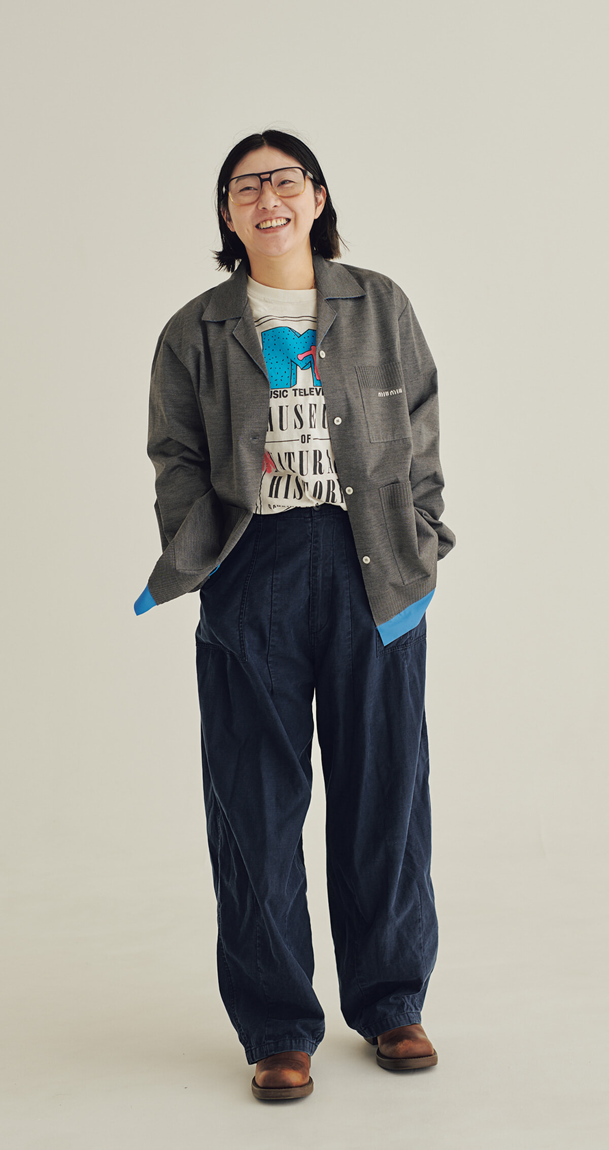 またミュウミュウでごめんなさい、でもそのくらい愛しているんです、と語る丸山。トップは今季の新作ニットシャツ。おしゃれな工場の作業員のようだったとたとえる同アイテムを使用したコレクションルックをイメージソースに、古着のTシャツとアールエイチシーのワークパンツで自分なりのリアルなワークスタイルに落とし込んだ。