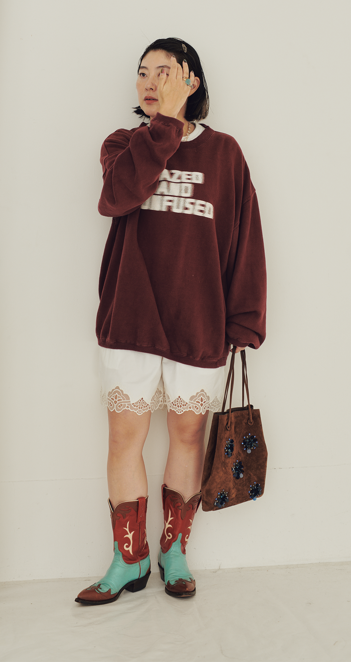過去何足も買ったもののこれしか履いていないという、唯一無二のヴィンテージのウエスタンブーツが主役。ルイーズ・トロッターをディレクターに迎えた新生カルヴェンのレースショートパンツを古着のスウェットに合わせて、ほんのりガーリーなエッセンスをプラス。異なる個性が絶妙にミックスされたハイブリッドなスタイルに。