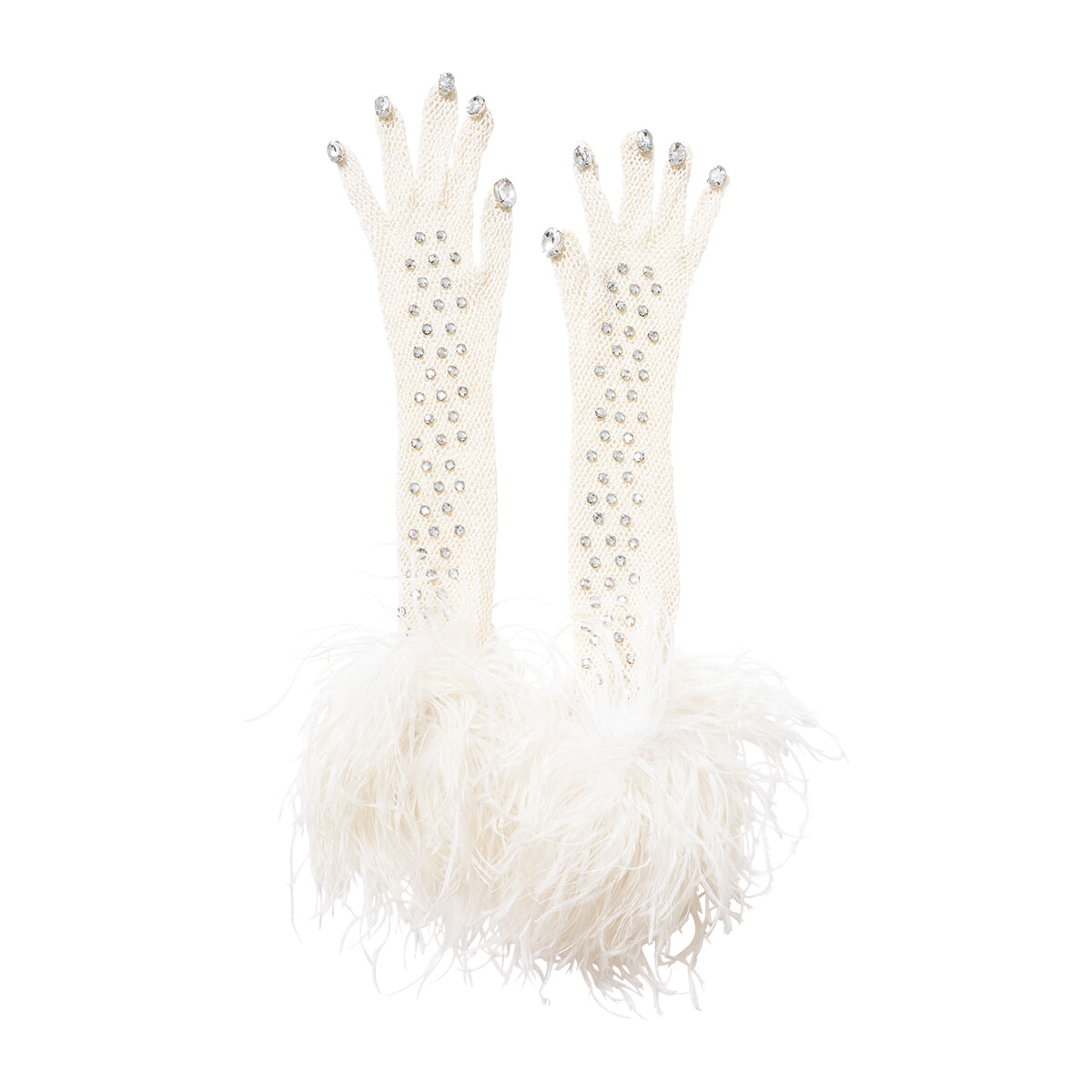 絆創膏モチーフのキラキラアクセサリーなど、乙女心くすぐるアイテムが人気のタナカダイスケ。腕からネイルにかけて大ぶりでキャッチーなビジュー、さらにボリュームのあるフェザーの装飾が施されたホワイトレースのロンググローブも注目だ。1点投入するだけでいつものスタイリングがとびきりロマンティックに変身するはず。