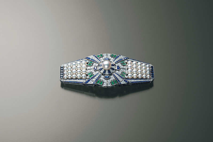1937年に開催され、世界中から多くの人々が訪れたパリ万国博覧会での展示作品「矢車」。弓の矢羽根を放射状に並べた日本の伝統的な装飾文様、矢車をモチーフにして、アコヤ真珠やダイヤモンド、カラーストーンを配した美しいデザイン。帯留としてだけでなく、リングやブローチ、かんざしなど12通りもの使い方ができるマルチウエアな仕立てになっているのが驚異的。この当時の日本のデザインや職人技のレベルが目を見はるほど高かったことを物語る、まさにレジェンドなハイジュエリーなのだ。