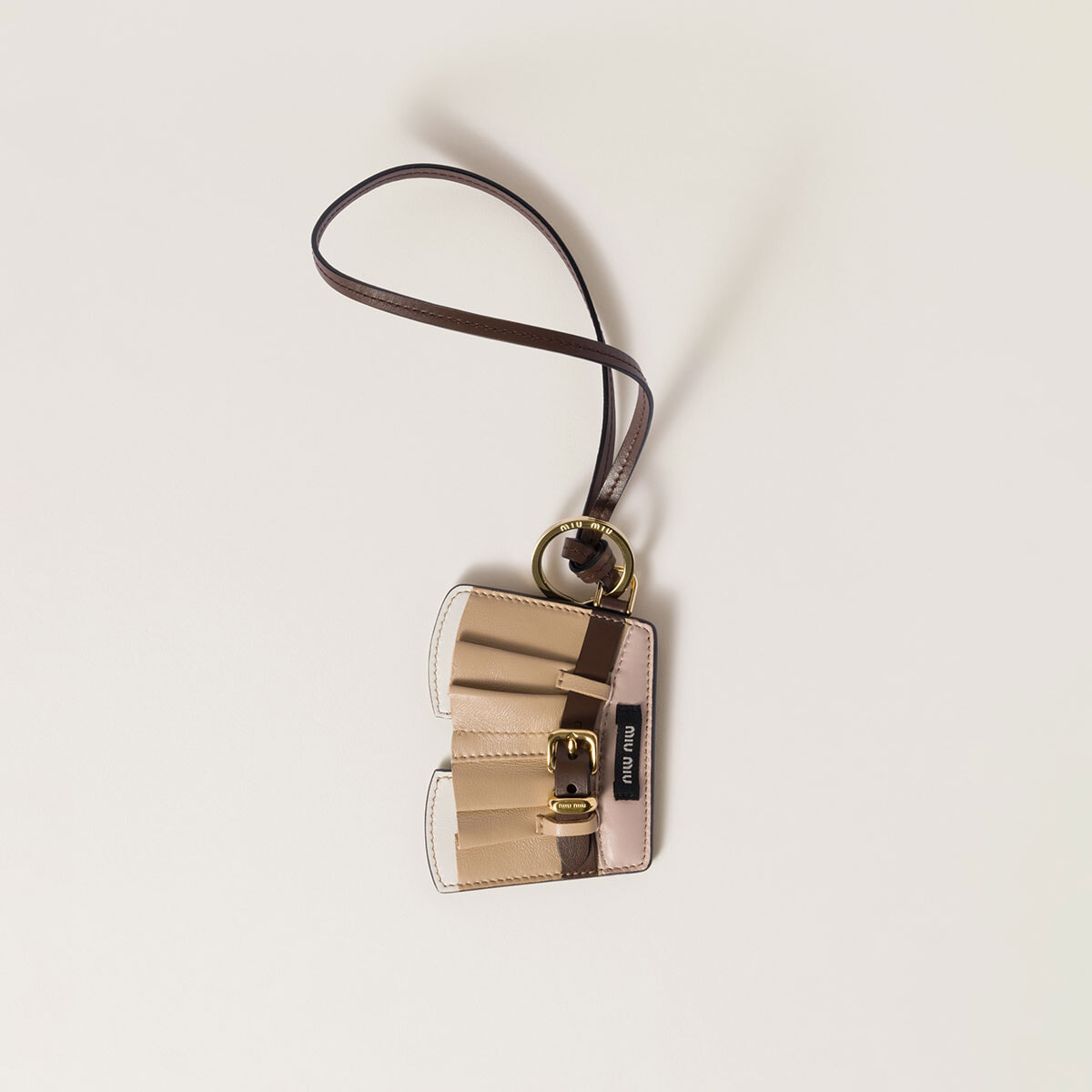 「憧れのブランドを取り入れることは、そのステータスの力をもらうことに繋がります。アイコニックなチャームは“ファーストミュウミュウ”にもおすすめ」(青木)。レザー キーリング トリック(シャツ、H11.8cm)¥82,500(予定価格)/ミュウミュウ(ミュウミュウ クライアントサービス) ※背面にミラー付き