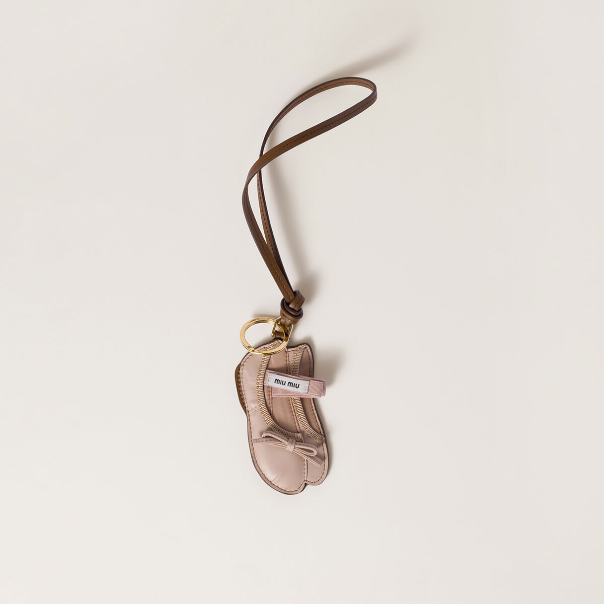 「ローファーモチーフのチャームと共通で、大地を踏みしめるイメージのフラットシューズは“地固めをしてくれる”という意味でおすすめです」(青木)。レザー キーリング トリック(ミュウ バレエシューズ、H10.4×W9.7cm)¥82,500(予定価格)/ミュウミュウ(ミュウミュウ クライアントサービス) ※背面にミラー付き