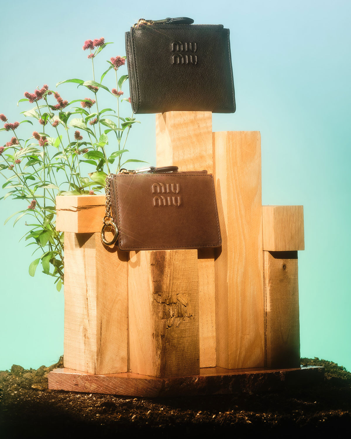 上から、ウォレット(ブラック、H8.5×W11.5cm)¥100,100、カードケース(ブラウン、H8×W11cm)¥83,600(すべて予定価格)/ともにミュウミュウ(ミュウミュウ クライアントサービス)