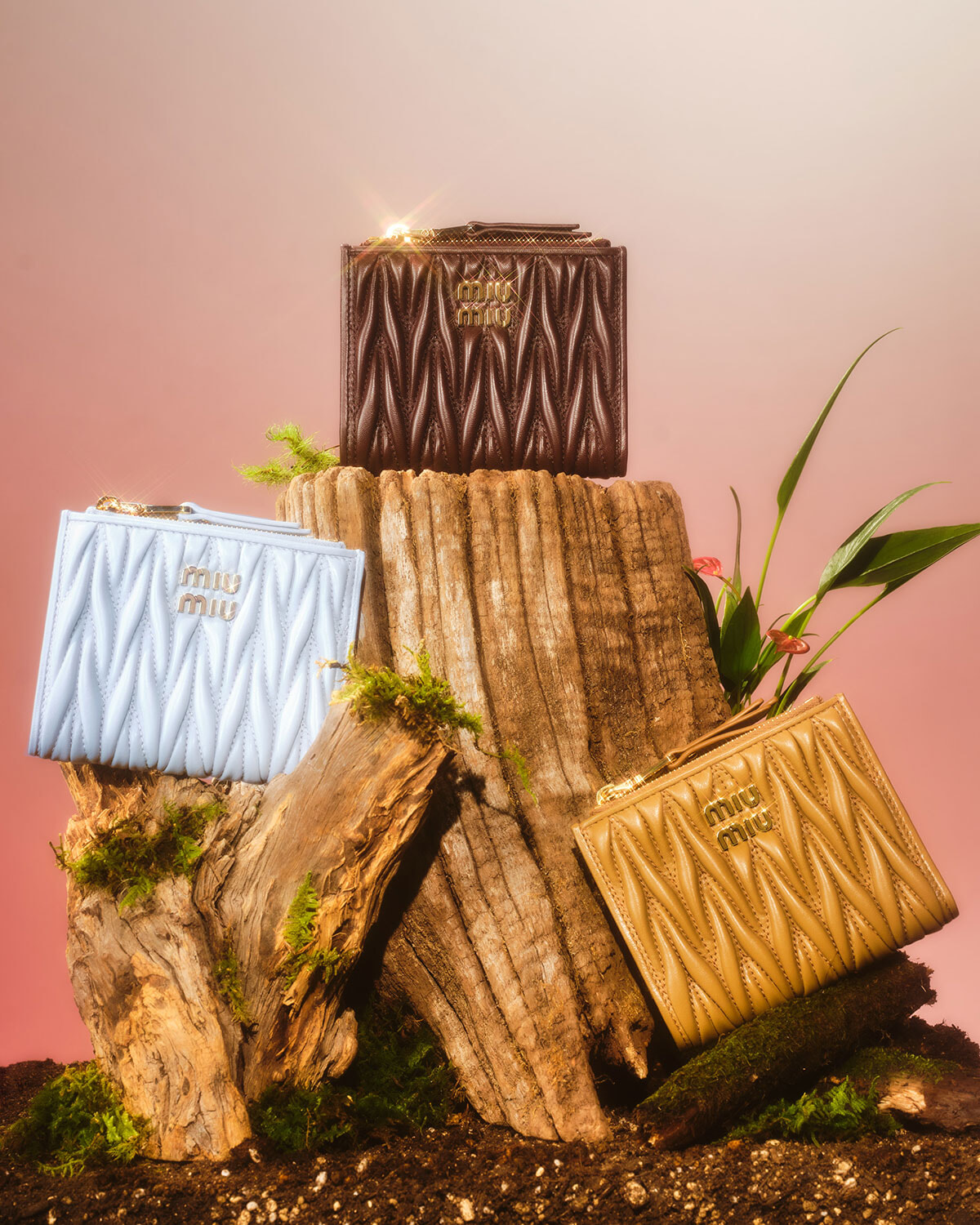 上から時計回りに、カードケース(ブラウン、H8×W11cm)¥83,600、ウォレット(コーンフラワーブルー、H9×W11.2cm)¥79,200、ポーチウォレット(ピンクベージュ、H8×W13.5cm)¥79,200(すべて予定価格)/以上ミュウミュウ(ミュウミュウ クライアントサービス)