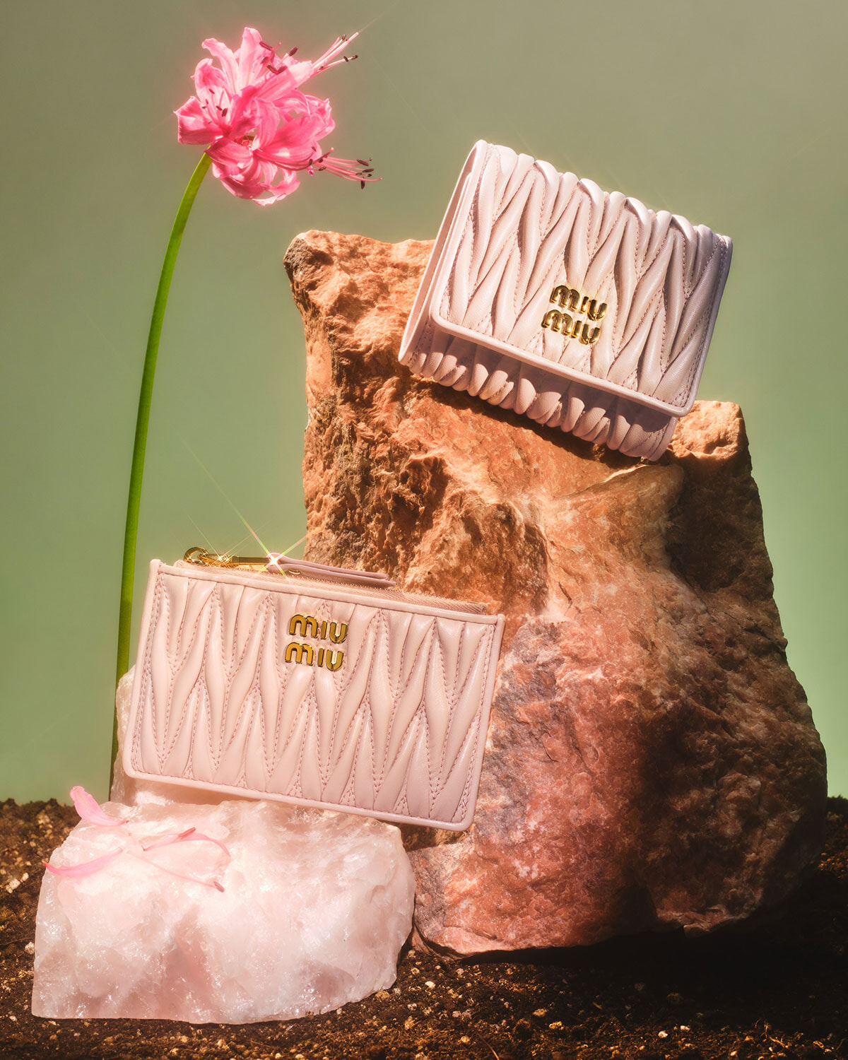 上から、ウォレット(ピンクベージュ、H7.8×W10.2×D3.8cm)¥84,700、ポーチウォレット(ピンクベージュ、H8×W13.5cm)¥79,200(すべて予定価格)/ともにミュウミュウ(ミュウミュウ クライアントサービス)