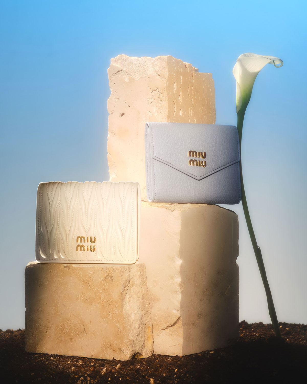 上から、ウォレット(コーンフラワーブルー、H9×W11.2cm)¥79,200、ウォレット(ホワイト、H11.2×W8.5cm)¥84,700(すべて予定価格)/ともにミュウミュウ(ミュウミュウ クライアントサービス)
