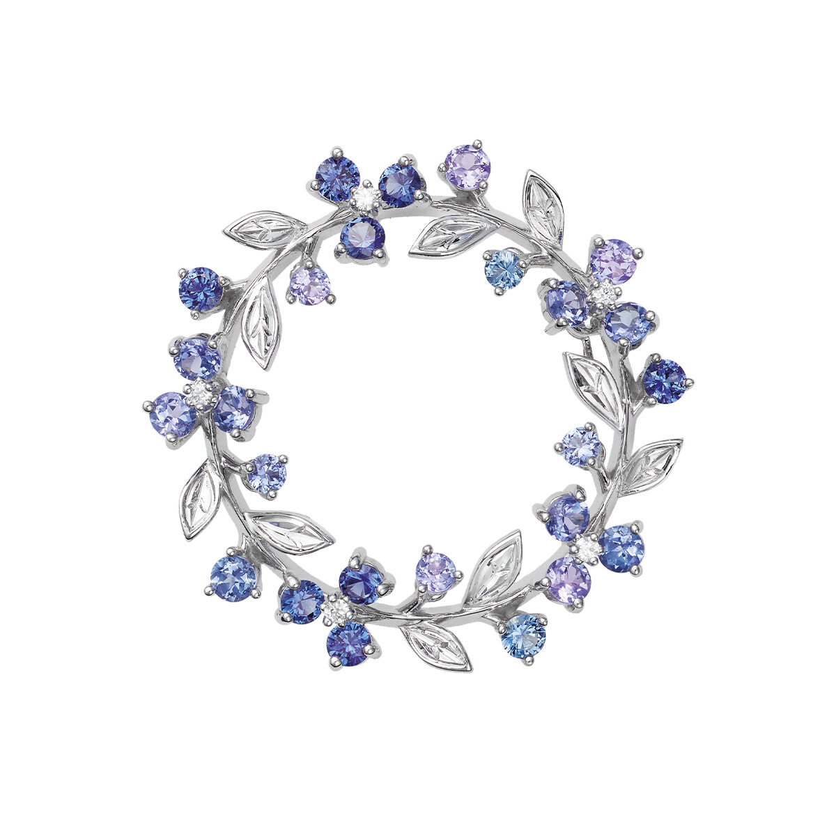 青と紫のグラデーションが、クールかつシックなリース形。控えめにセッティングされたダイヤの周りの貴石は小花のようで、可憐な印象も与える。