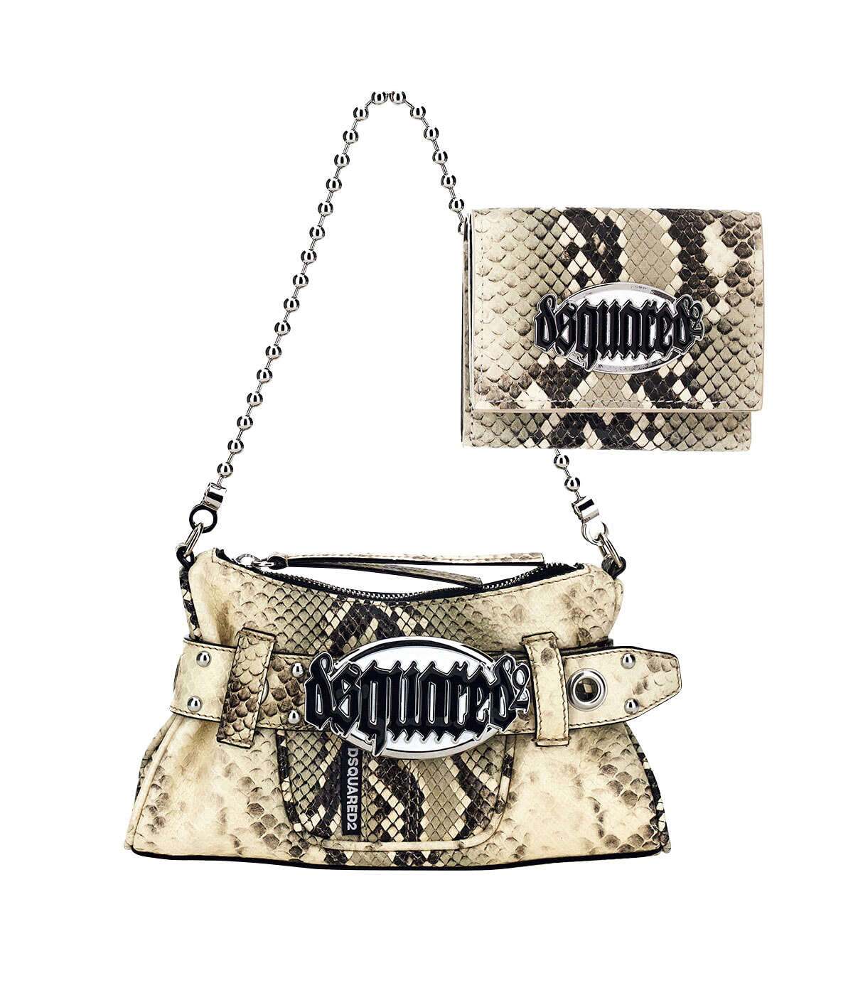 右上:プレゼントに最適な三つ折り財布(H8.5×W10×D3cm)¥79,200 左下:牛皮にヘビ柄をプリントした「ゴシックベルトバッグ クラッチ」(H16×W23×D7cm)¥190,300/ともにディースクエアード(スタッフインターナショナル ジャパン クライアントサービス)